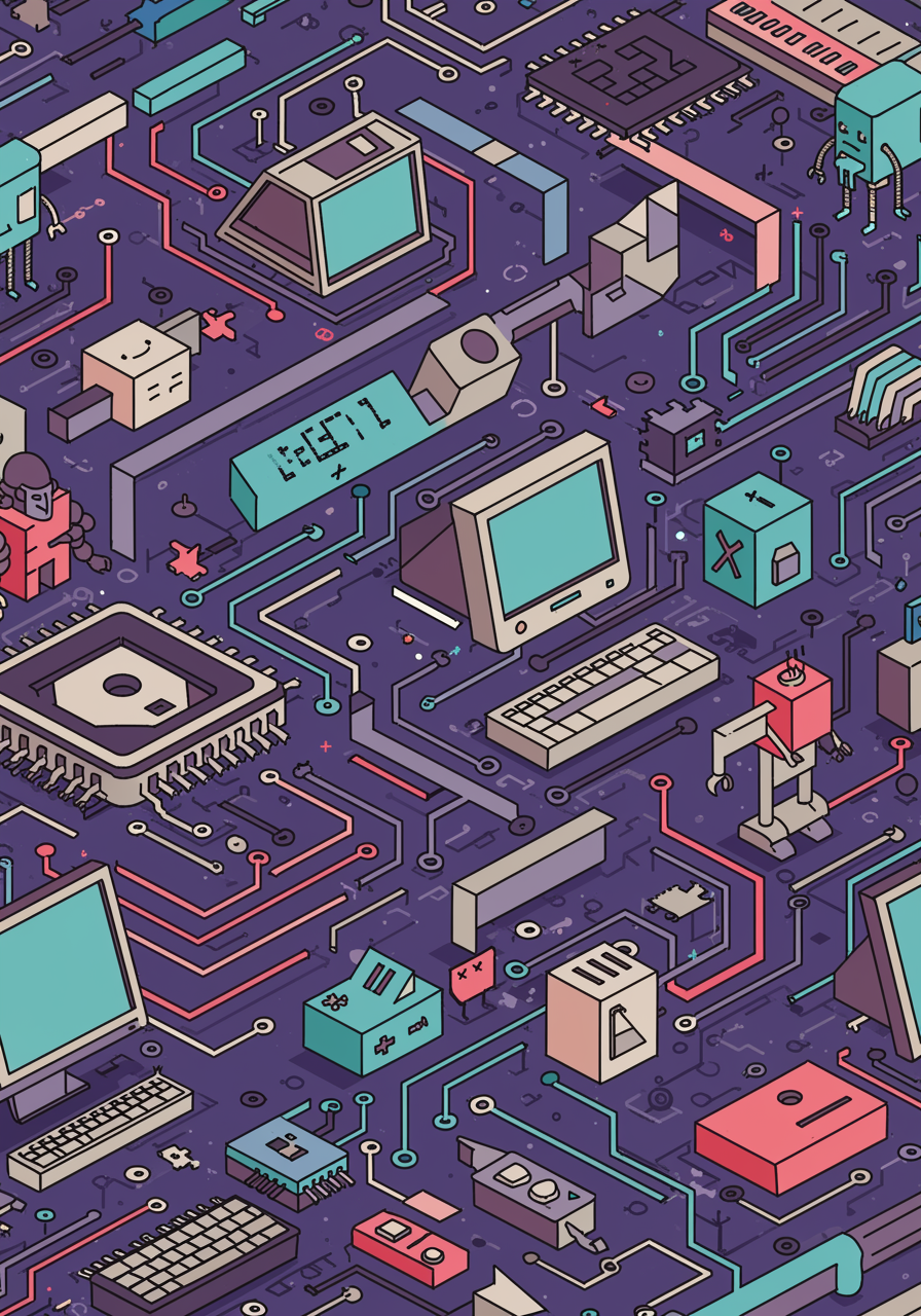 Imagine a whimsical, retro-futuristic illustration where vibrant, abstract computer components float harmoniously in an endless digital landscape. Playful, neon-colored circuit lines form intricate patterns resembling urban street maps, connecting a lively array of geometric shapes and symbols. These elements represent computer circuitry in an exaggerated, almost dream-like representation, with exaggerated proportions and a combination of both 2D and 3D designs. Enormous vector icons such as floppy disks, pixelated monitors, and quirky keyboard keys intermingle with stylized, friendly-looking robotic characters, all rendered in a crisp, clean SVG style. The scene conveys a sense of dynamic motion and connectivity, capturing the essence of digital age clipart with a touch of nostalgia.