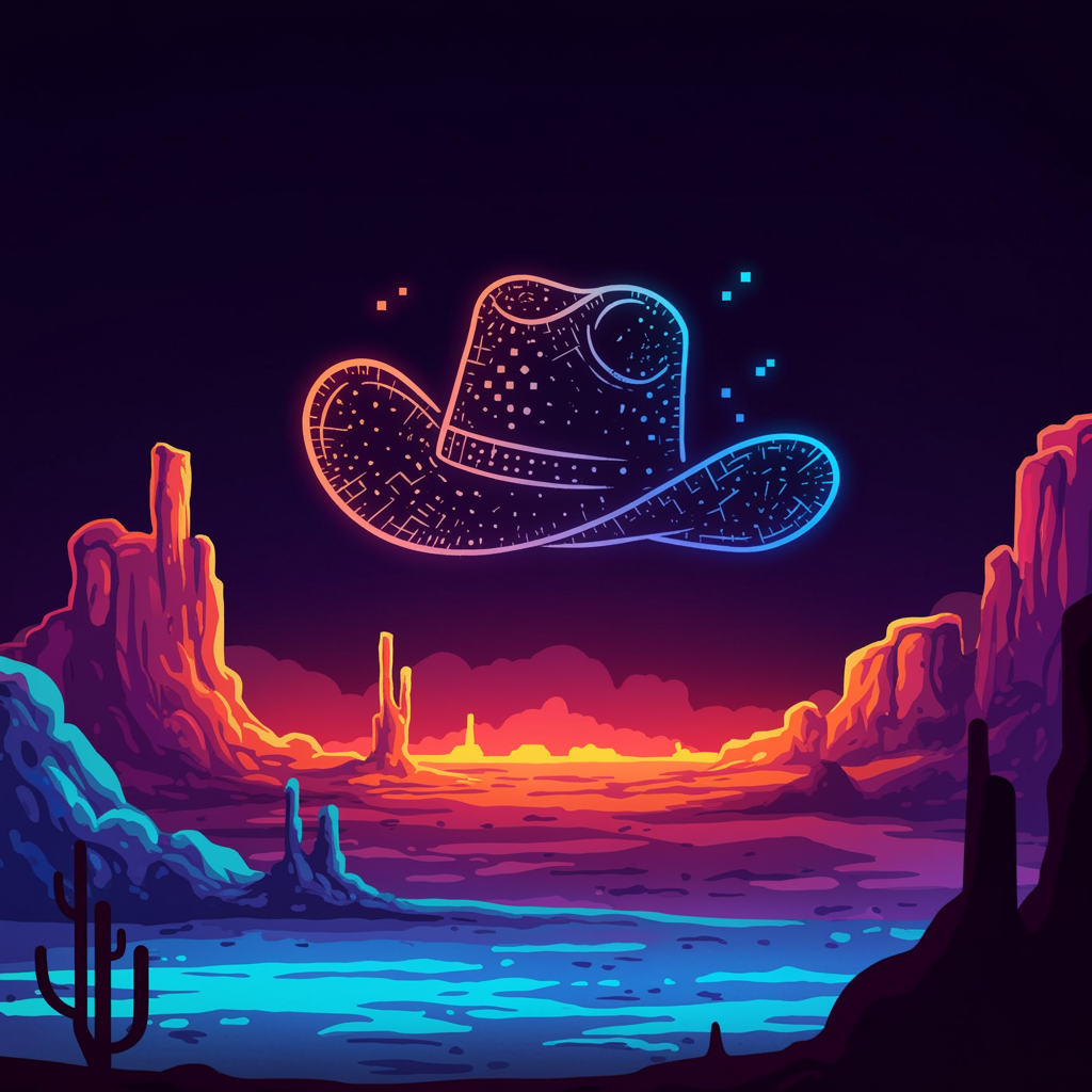 Imagine a whimsical fusion of the digital world and the Wild West, where vibrant and dynamic vector shapes gather to dance in a digital rodeo. At the center of this energetic scene, a bold, stylized cowboy hat clipart, crafted from an intricate array of SVG lines and curves, floats majestically against a backdrop of abstract, glowing vector landscapes. Each element pulsates with the rhythmic energy of neon brights, creating an electrifying visual symphony. The hat itself, though a simple silhouette, is adorned with pixelated embellishments, harmonizing the vintage essence of the cowboy spirit with the futuristic allure of vector artistry. Shadows and highlights, rendered with geometric precision, play with depth and dimension, inviting the viewer into a realm where tradition meets technology in a colorful celebration of clipart creativity.