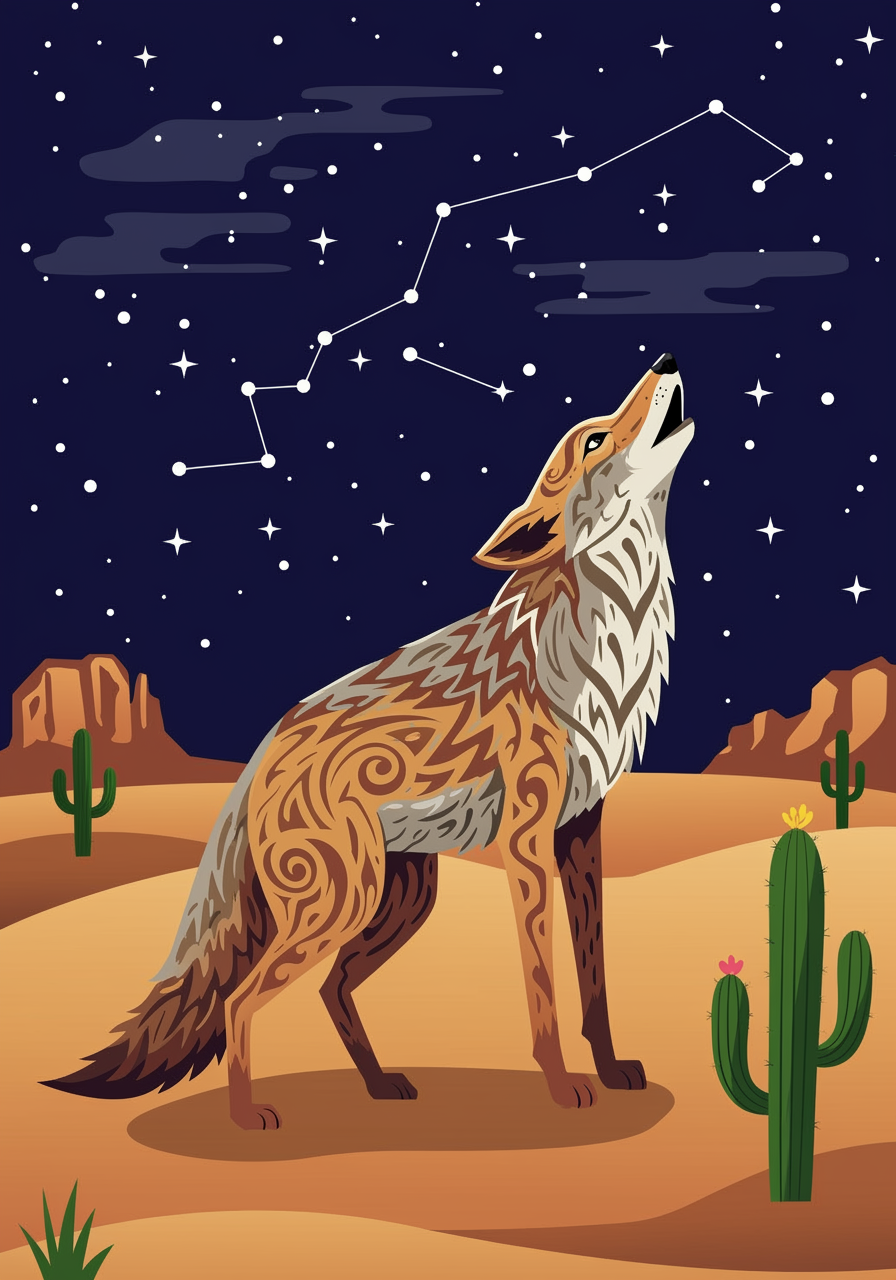 Envision an intricate SVG vector illustration capturing a whimsical scene of a coyote in mid-howl beneath a starlit desert sky. The coyote, imbued with a sense of mischief and wisdom, is adorned with intricate tribal patterns that swirl across its fur. Its eyes gleam with a cunning intelligence, reflecting the constellations above. The landscape around it is a minimalist dreamscape of rolling dunes and sparse cacti, each rendered with clean lines and subtle gradients, whispering tales of the arid wilderness. The overall composition is a harmonious blend of abstract geometric forms and detailed naturalism, creating an image that resonates with the haunting elegance of the desert's nocturnal symphony.