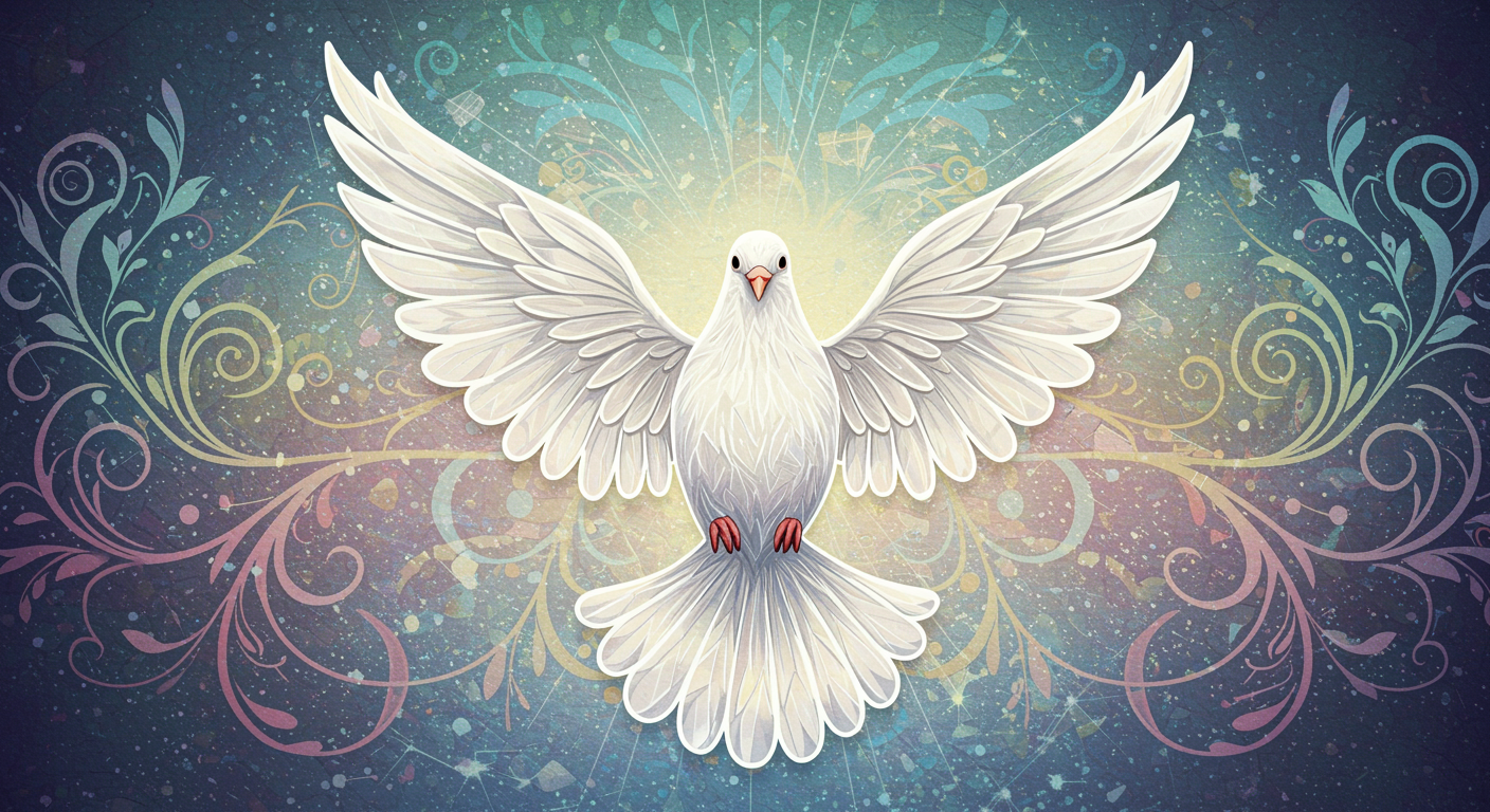 Imagine a dreamlike tapestry unfolding with a serene white dove at its center, its form delicately composed of interwoven, flowing vector lines that mimic the grace of a gentle breeze. The dove's wings spread wide, crafted from an intricate lattice of translucent geometric shapes and celestial tones. Behind the bird, a swirling mosaic of soft pastel hues morph into abstract vinelike patterns, evoking a tranquil garden of dreams. Subtle hints of starry constellations and whimsical swirls dance around the dove, creating an ethereal aura that exudes peace and infinity in this enchanting clipart rendition.