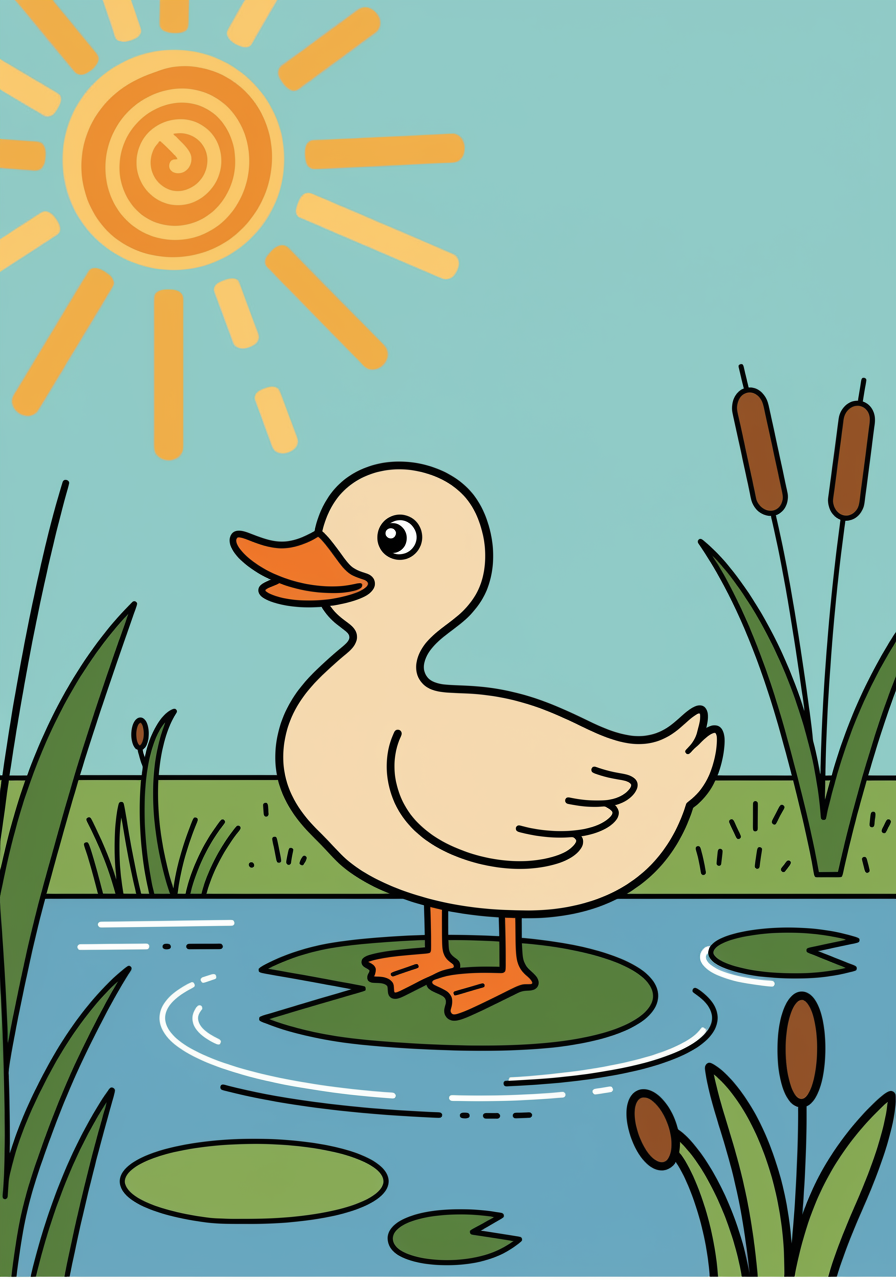A whimsical scene unfolds in a vibrant digital landscape where a cartoonish duck stands cheerfully on a floating lily pad amidst a tranquil pond. The duck is crafted with bold, fluid vector lines, exuding a joyful aura with its oversized beak and bright, expressive eyes. Surrounding it are playful swirls and geometric patterns of water ripples rendered in a minimalist SVG style, seamlessly blending abstract and organic forms. Nearby, stylized cattails and reeds peek curiously from the pond's edge, their shapes and colors echoing the simple yet dynamic vector art theme. Overhead, a sun of intricate spirals and radiating triangles casts a warm glow, adding a splash of whimsy to this delightful duck clipart masterpiece.