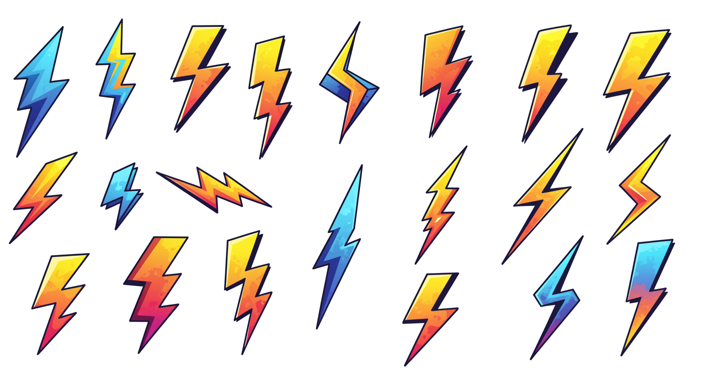 Create a vibrant image featuring a dynamic collection of SVG-style vectors, each uniquely interpreting the form of a lightning bolt. These artistic renditions should vary in size and style, with some echoing the jagged, sharp angles synonymous with electricity, while others take on fluid, abstract forms. Imagine a kaleidoscope of colors pulsating within each bolt, from electric blues and neon yellows to fiery reds and shimmering purples, set against a stark white backdrop. The composition should capture the essence of energy and movement, as if the bolts are alive and dancing across the canvas, each telling its own story within this electrifying clipart collage.
