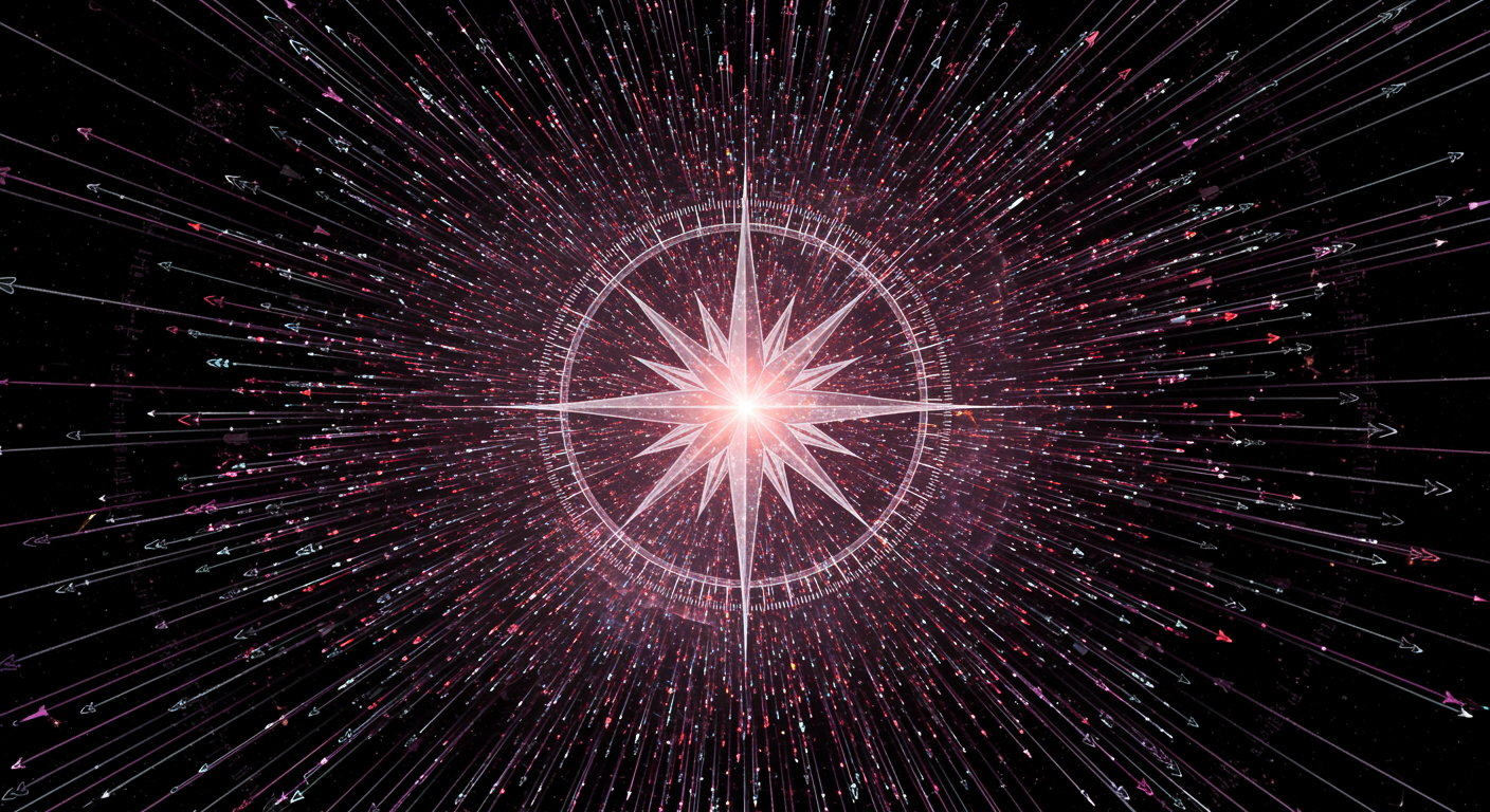 In a vibrant digital cosmos, visualize an intricate SVG landscape where glowing vectors stretch infinitely in all directions, forming a grand tapestry that pulsates with the essence of mathematical elegance. Each vector is represented by a luminous arrow, their pointed tips shimmering with the energy of the universe, while colorful lines radiate outward to form a mesmerizing grid. The magnitude of each vector appears as a brilliant, shifting halo around its shaft, illustrating a spectral dance of movement and strength. Near the center of the composition, a giant, translucent compass rose is superimposed, its arms rotating slowly, casting prismatic shadows on the web of vectors. This symbolic universe vibrates with the harmonious balance between direction and magnitude, celebrating the infinite possibilities within vector mathematics.