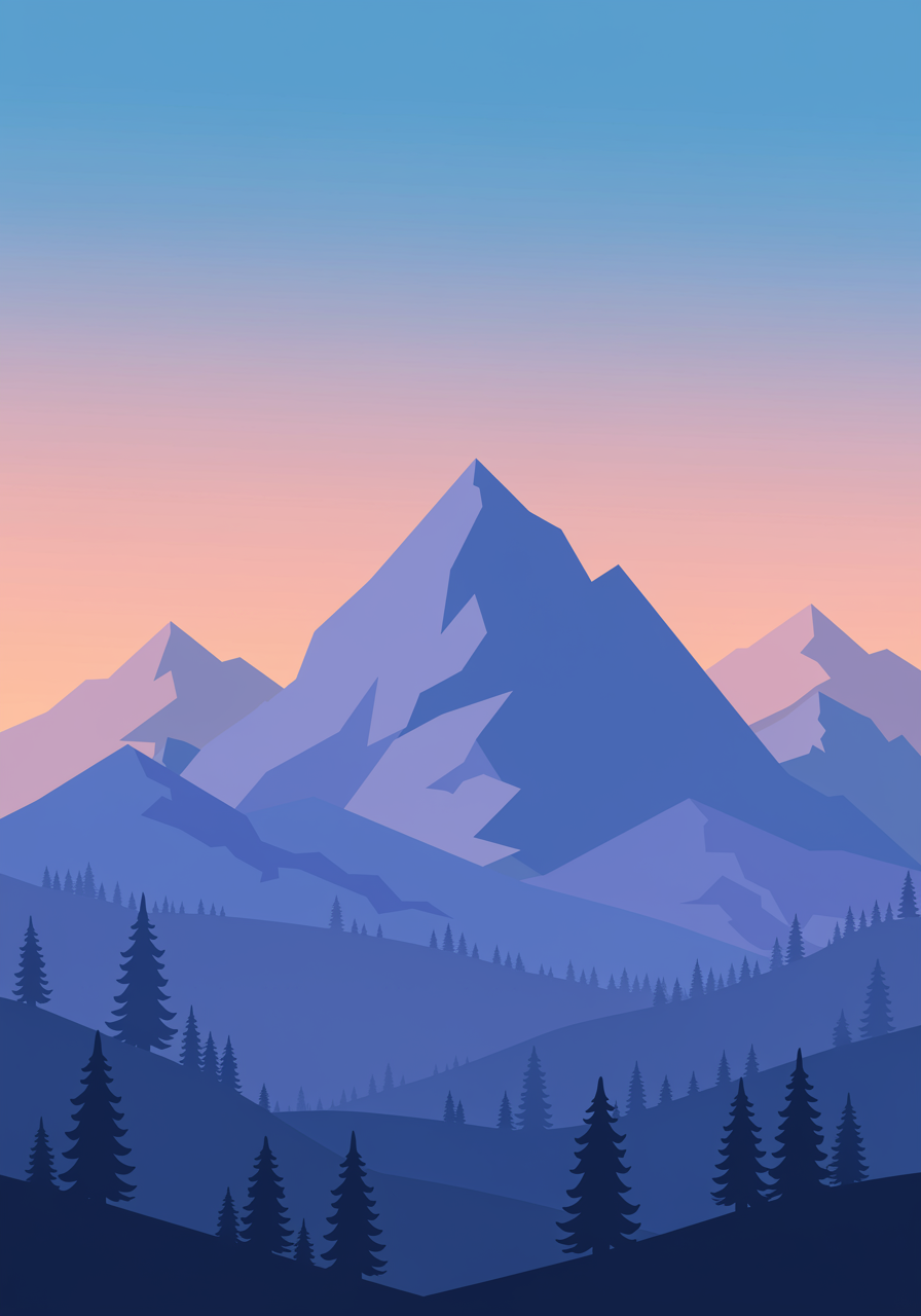 Imagine a digital landscape where the geometric precision of vector art meets the majesty of towering mountain peaks. Picture a minimalist SVG illustration that combines crisp, clean lines with subtle gradients to evoke the rising sun casting soft hues over a serene mountain range. The scene employs abstract shapes to depict slopes and contours, with each mountain peak distinguished by differing shades of cool blues and purples. Tiny vector-drawn pine trees dot the foothills, adding a touch of natural complexity to the geometric simplicity of the scene. The sky above is a seamless vector gradient, transitioning from dawn’s gentle pinks and oranges to the deep azure of a waking day, encapsulating both the precision of technology and the timeless beauty of nature.