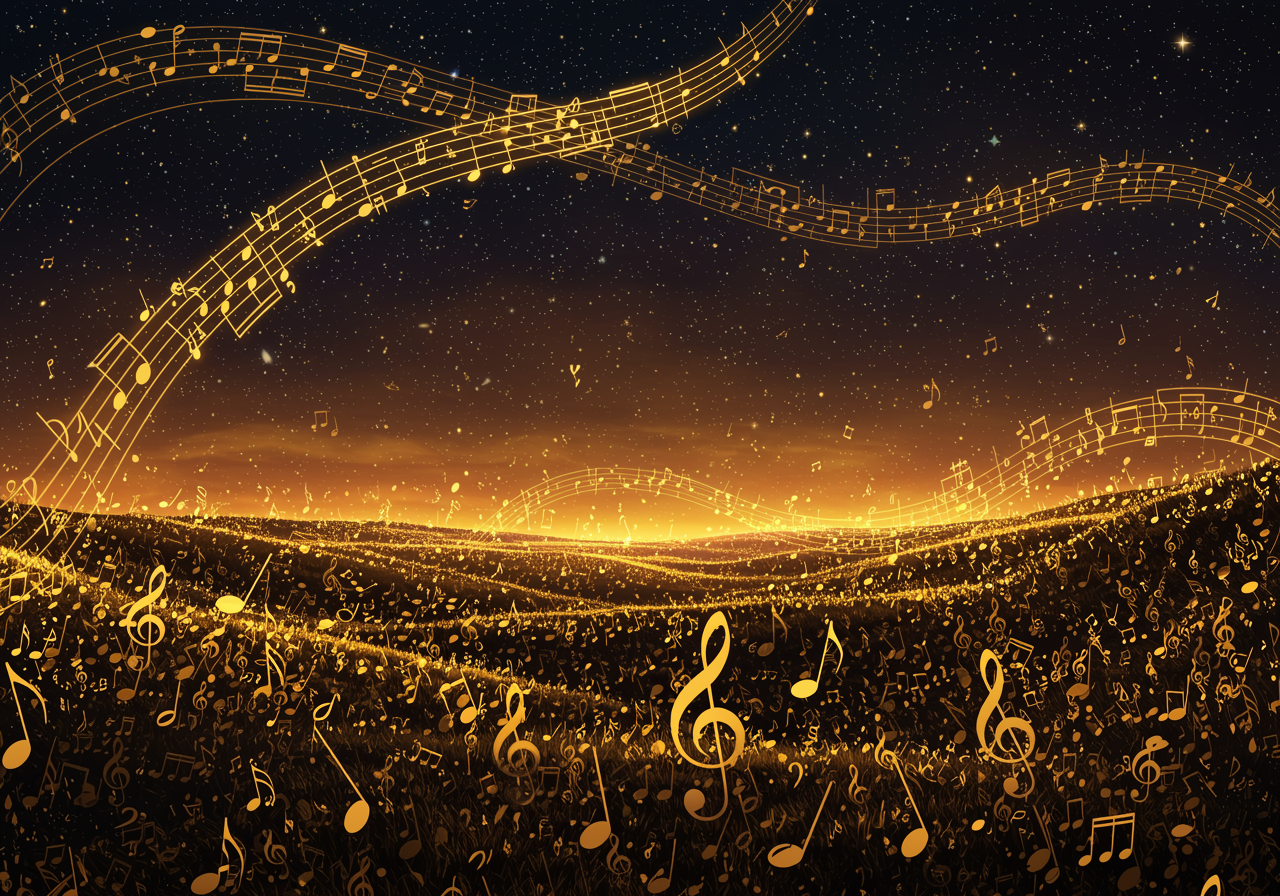 Envision a surreal landscape where musical notes take on a life of their own, each blending seamlessly into a world of geometric precision and abstract fluidity. Imagine intricately detailed vectors, sprawling like branches of a mathematical tree, with SVG-style clarity. These vectors twist and turn, forming an elaborate tapestry that tells a melodious story, each note drawn expertly, tracing invisible paths through a starry night sky. The music notes themselves hover and shimmer, suspended in mid-air like particles of golden light or scattered celestial script, creating a visual symphony that dances with elegance and rhythm. This digital artwork captures a harmonious blend of technical accuracy and artistic freedom, a visual representation of music as an endless flow of beautifully organized chaos.