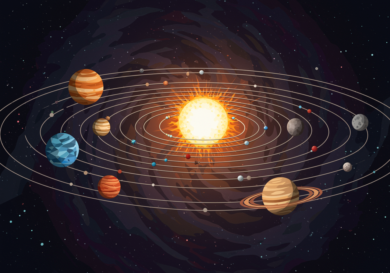 An intricate SVG illustration of the solar system, where each planet is represented by a unique geometric vector design, featuring vibrant and contrasting colors. The planets orbit in synchrony, connected by delicate lines that create a mesmerizing pattern, with the sun at the center depicted as a radiant, fractal-like explosion of light and energy. The background is a swirling cosmos of abstract shapes and gradients, adding depth and a sense of boundless space to this celestial tableau.