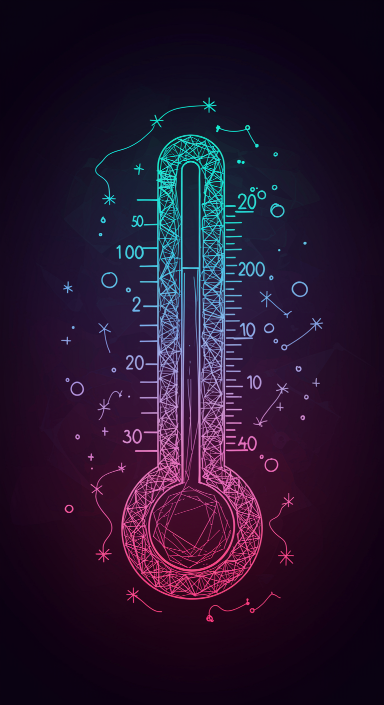 Imagine a whimsical thermometer clipart emerging as a constellation of interconnected line vectors, where intricate SVG paths weave through a vibrant digital cosmos. This thermometer, adorned with playful numerical markers, stretches elegantly like a futuristic totem. Surrounding it, an aura of fluctuating color gradients ebbs and flows, symbolizing warmth and coolness, as if telling a visual story of changing climates. The backdrop is a tapestry of geometric patterns, suggesting a dance of mathematical precision and artistic flair, creating a captivating symphony of form and function that captures the essence of digital creativity.