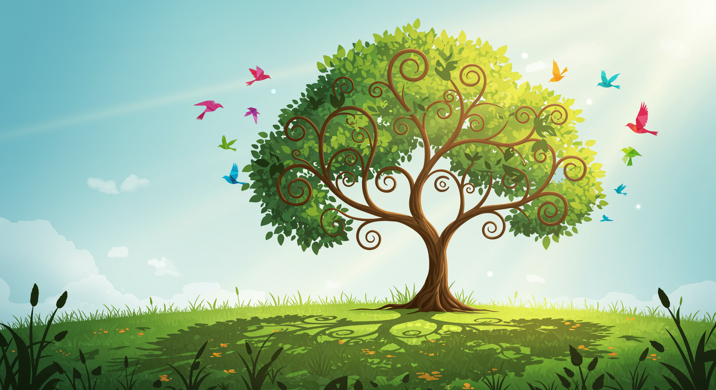 A whimsical scene where an elegant tree stands majestically in the center, its branches extending into intricate, swirling patterns reminiscent of mathematical vectors, each adorned with vibrant leaves shaped like delicate, geometric forms. Sunlight filters through, casting shadows that morph into vivid, abstract shapes resembling SVG designs on the ground, while an array of colorful birds, resembling animated arrowheads, weave amongst the branches, creating a lively dance of nature and technology.