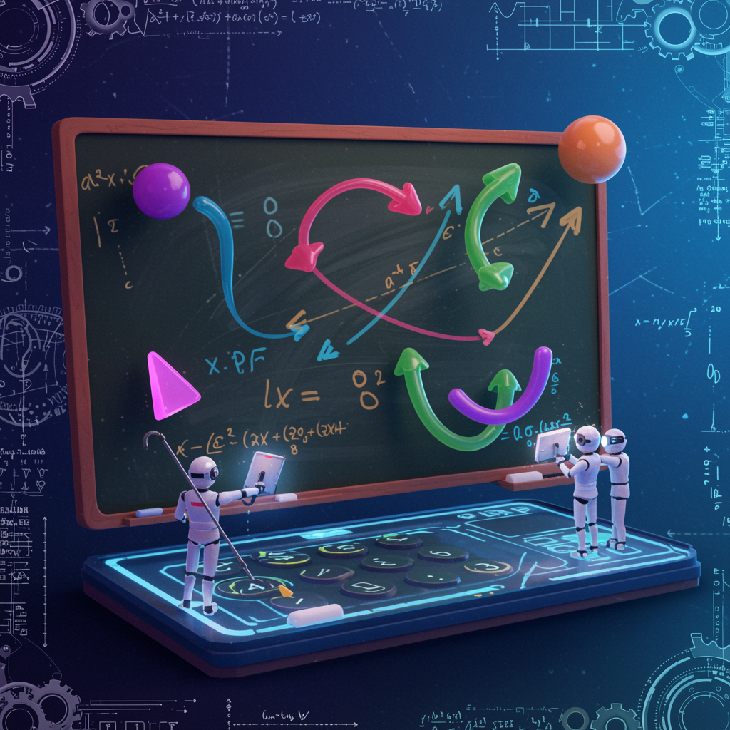 Create an imaginative scene illustrating a whimsical, futuristic chalkboard where mathematical vectors come to life as vibrant, animated arrows and shapes. These dynamic entities float and intertwine in a colorful symphony, dancing across a slick digital interface that acts as a vector addition calculator. Hovering holographic equations shimmer in mid-air, while tiny robotic assistant figures with glowing visors meticulously adjust the vectors’ trajectories. The background is a gradient of twilight hues, giving an ethereal, other-worldly feel, as sparkling grids and spinning gears frame the edges, evoking a sense of digital precision and infinite possibility.