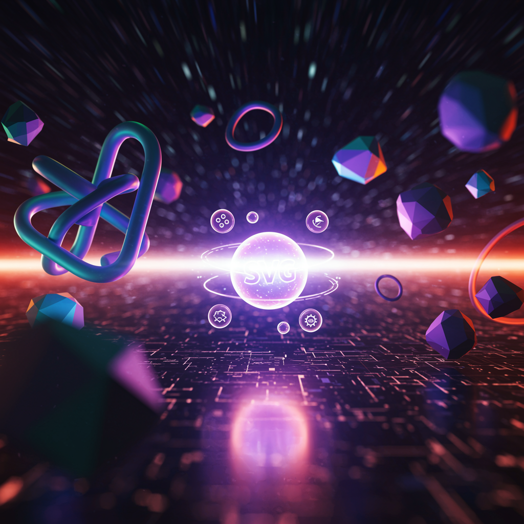 Imagine a futuristic digital landscape where vibrant, three-dimensional geometric shapes float effortlessly in a vast, glowing void. These shapes—composed of sleek, sharp-edged vectors—intertwine and overlap, creating intricate patterns akin to a kaleidoscope's ever-changing tapestry. Each vector shape radiates its own luminous hue, casting a colorful spectrum that dances across the scene. The space is boundless, with a horizon that blurs into a burst of pixels and lines, symbolizing the infinite possibilities of creativity in a world defined by vector graphics. Central to this ethereal composition is a luminous orb, hovering in the foreground, where a series of dynamic, translucent SVG icons swirl around it, signifying the essence of the vector format in a mesmerizing ballet of design and technology.
