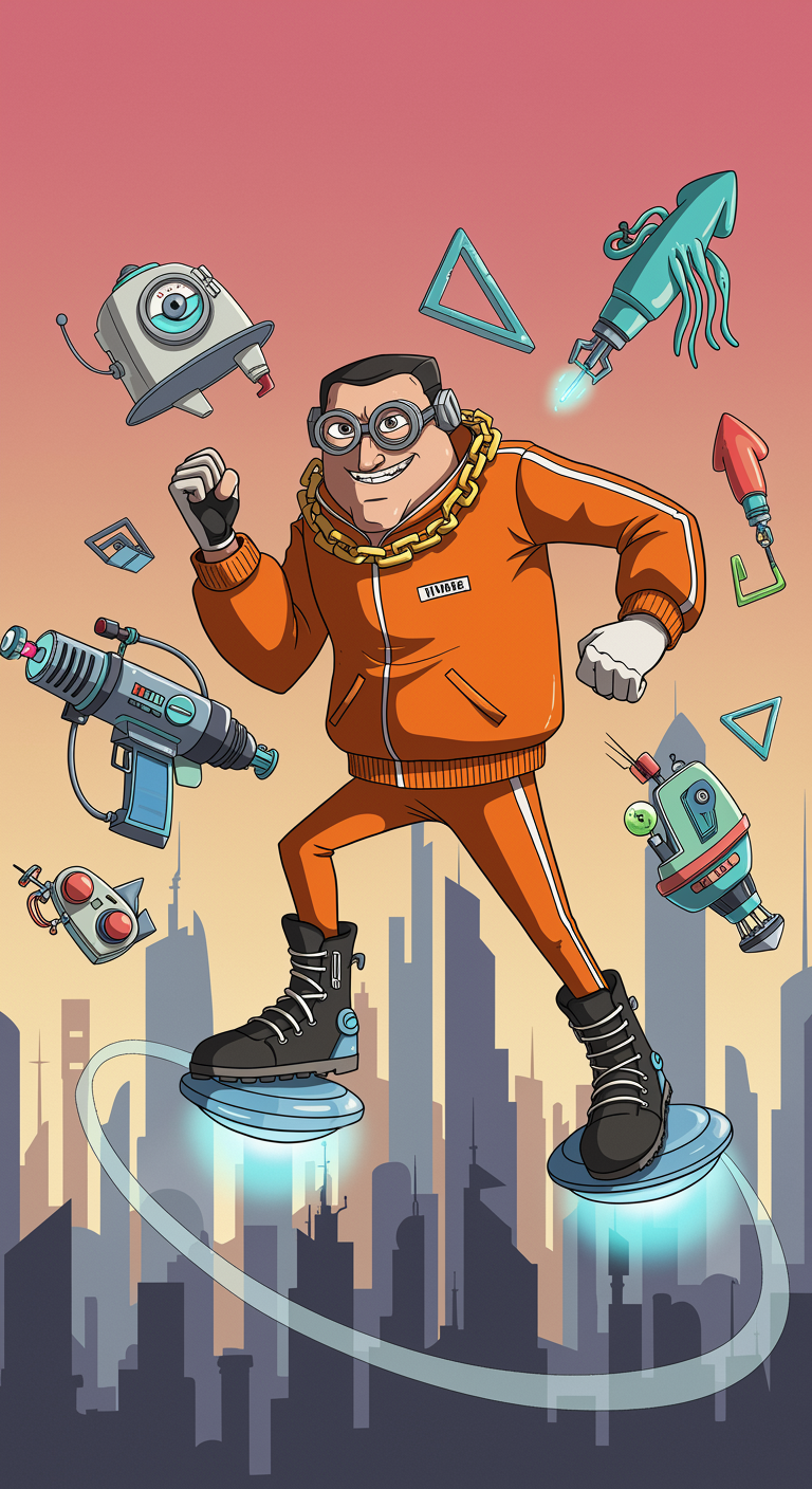 A whimsical fusion of artistry and animation brings to life the notorious character Vector from Despicable Me, captured in a dynamic SVG illustration. Imagine Vector poised atop his sleek levitating boots, clad in his signature orange tracksuit, surrounded by a swirl of geometrically precise lines and shapes. Abstract representations of his various gadgets, from shrink rays to squid launchers, orbit around him like a mechanical solar system. The background is a stylized cityscape, with angular skyscrapers and vibrant hues that echo the playful yet mischievous tone of the film. The overall composition, a harmonious blend of crisp vector lines and vivid colors, perfectly encapsulates Vector’s boisterous yet ingenious personality, inviting viewers into a world where villainy and art intersect.