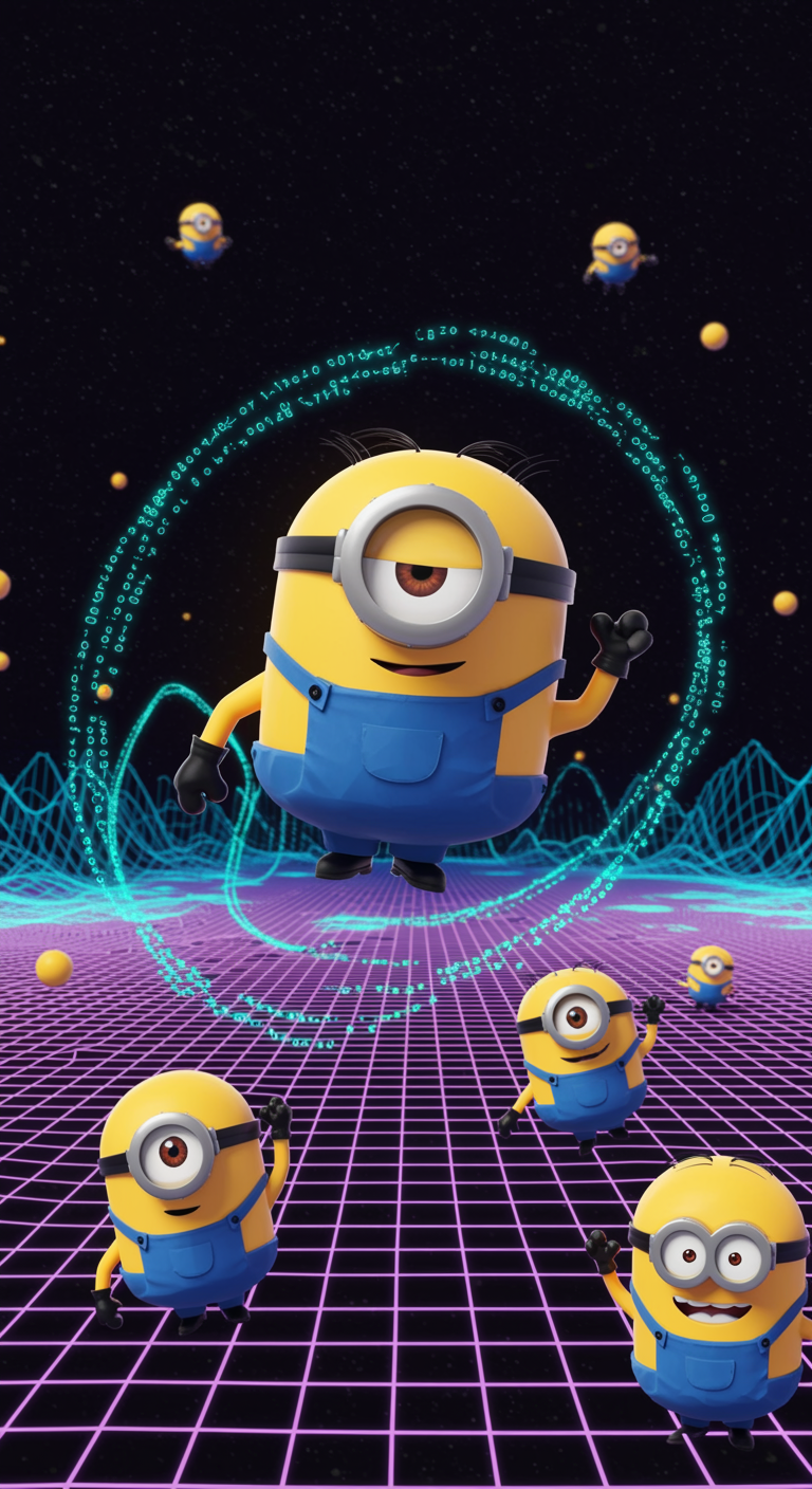 Imagine a digital utopia where minions, with their iconic goggles and mischievous smiles, are transformed into sleek, minimalist vectors. These playful characters are depicted as abstract, geometric forms, each characterized by bold, dynamic lines and vibrant colors, suspended in a virtual cosmos. They're surrounded by swirling data streams, resembling comet trails, which represent the flow of digital information in a futuristic cyber landscape. The background is a vast, infinite grid that stretches beyond the horizon, glowing softly with a blend of neon hues. This image captures the harmonious fusion of charming whimsy and cutting-edge technology, spotlighting these vector minions as digital guardians, exuberantly exploring a universe where code and creativity collide.