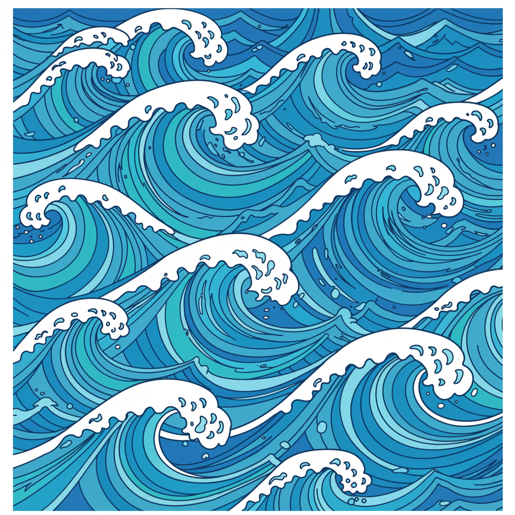 Create an image that blends the structured elegance of mathematical vectors with the whimsical, flowing movement of ocean waves. Imagine a sea where each wave is meticulously crafted from intricate, multicolored vector lines, tracing the paths of currents as if drawn by a mathematician's hand. The waves should crest and curl in a mesmerizing pattern, their smooth arcs forming a harmonious dance of geometry and nature. Vibrant hues of blue, teal, and aqua intertwine with bold white foamy accents, illustrating the dynamic ebb and flow of water. This visual symphony should evoke the fluidity of the sea, captured through the precision of vector art, creating a captivating wave clipart that embodies both structure and freedom.