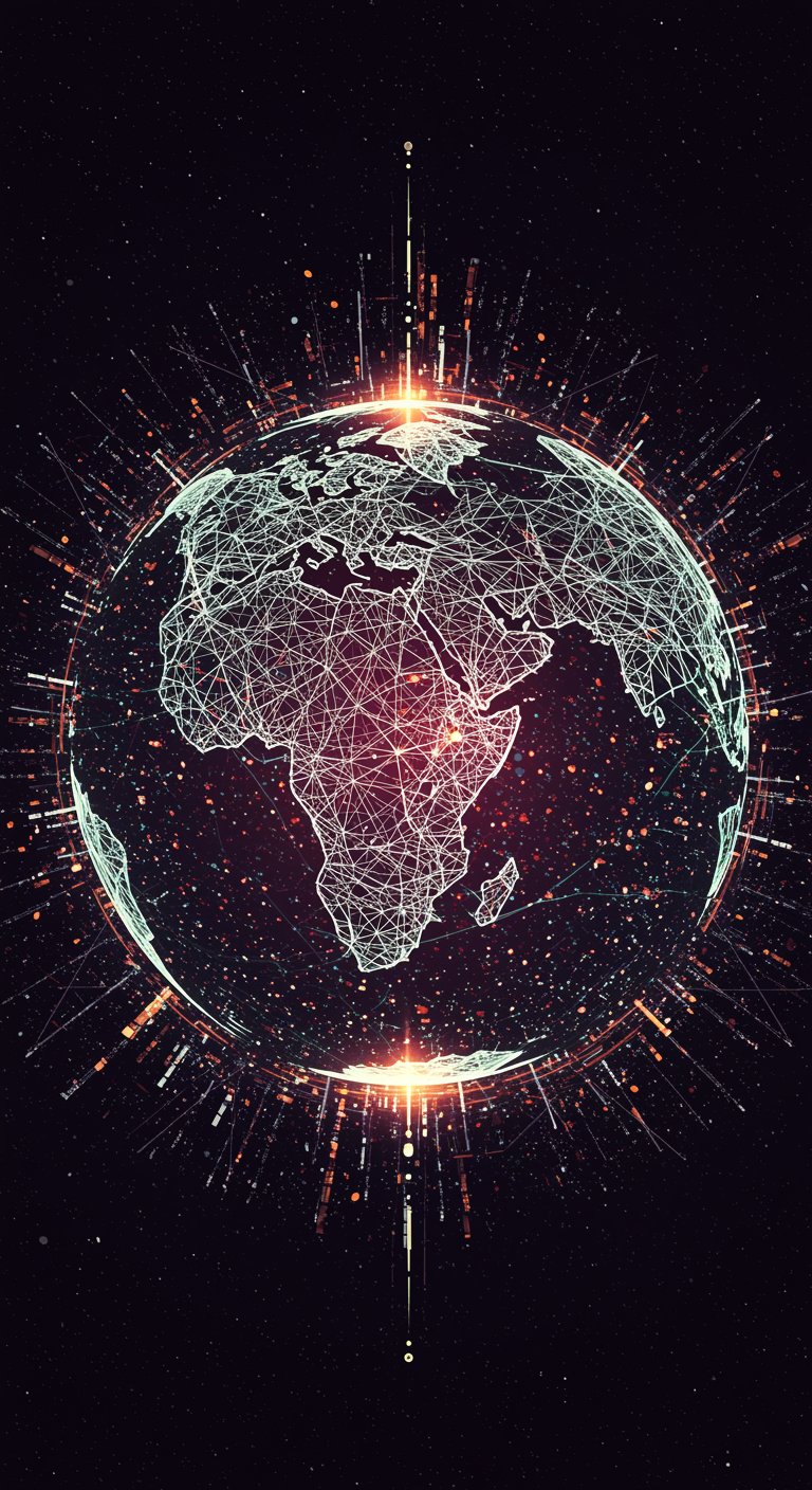 Imagine a surreal vector illustration resembling a cosmic tapestry, where the vast expanse of the world is intricately transformed into a digital mosaic. At its core lies an elaborate, geometric representation of the earth's continents, delicately interwoven with luminous threads, symbolizing the connections uniting disparate lands. The equator is depicted as a pulsating, vibrant line of light that bisects the globe, radiating energy and balance, and casting a spectrum of colors across the map. Surrounding this digital earth are constellations of abstract shapes and patterns, each vector element appearing like the building blocks of a new age of exploration, suggesting the infinite possibilities in a connected world. This image seamlessly merges the precision of SVG art with the organic complexity of a world's vision, inviting viewers to traverse its dimensions.