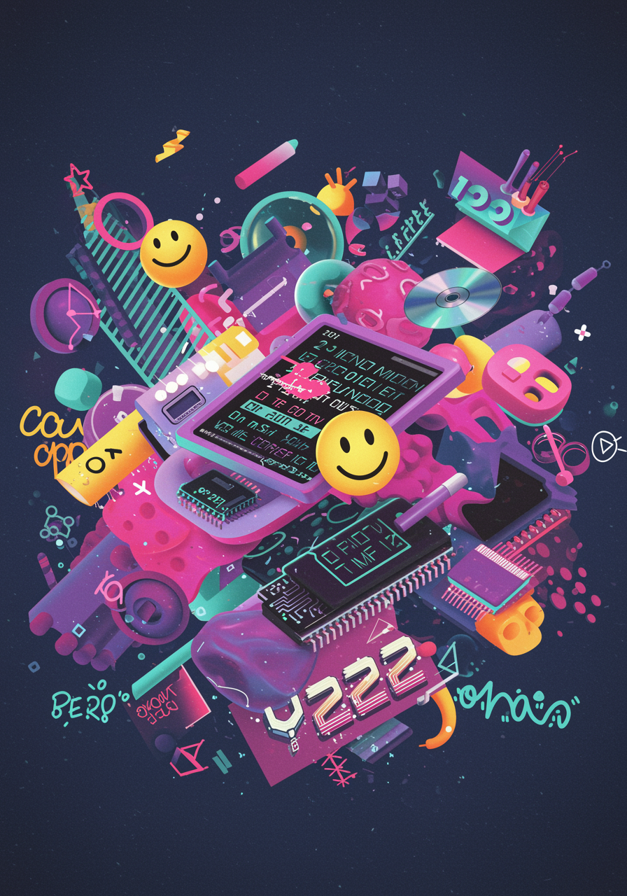 A vibrant composition of futuristic vectors and SVG shapes intertwines with a retro Y2K aesthetic, featuring metallic textures and neon gradients reminiscent of early 2000s digital art. The scene is a chaotic symphony of abstract geometries and pixelated glitches, with holographic circuits and binary codes drifting through a dreamscape of nostalgia and technological wonder. Fluorescent colors burst across the canvas, converging into playful doodles and whimsical patterns, capturing an era where cyberspace imagination knew no bounds. Floating elements, such as 3D-rendered smiley faces and hovering CD-ROMs, add a touch of surrealism and charm, blending the nostalgia of Y2K with the precision of modern vector art.