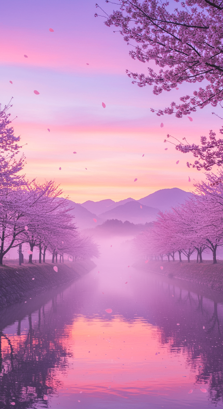 A serene landscape where misty mountains meet a pastel sunset, the sky painted in soft gradients of pink and lavender, with delicate cherry blossom petals floating through the air and a tranquil river reflecting the dreamy hues, creating an enchanting and calming aesthetic design perfect for a wallpaper backdrop.