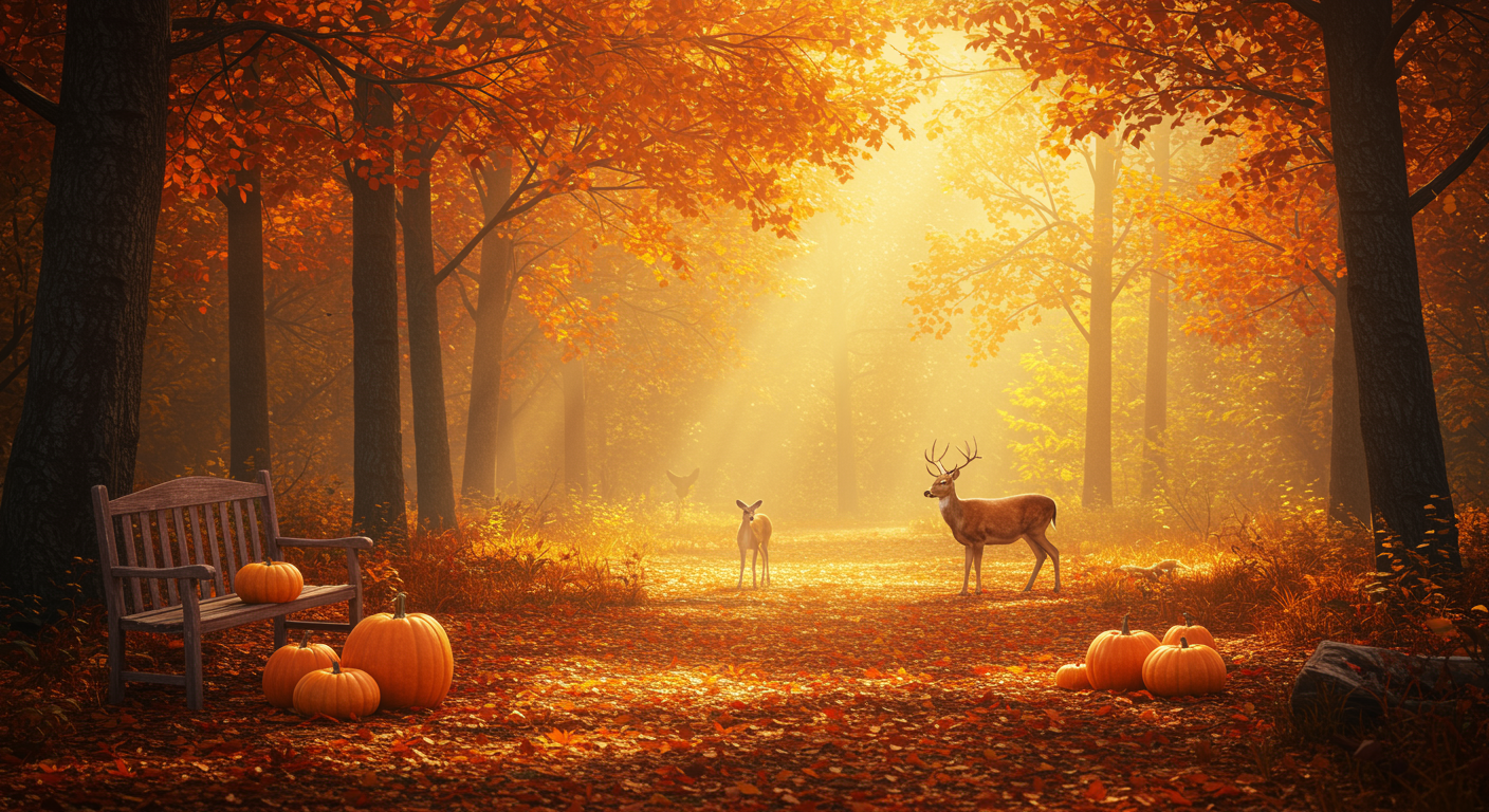 Imagine an ethereal woodland bathed in the golden hues of autumn, where sunlight filters through a canopy of fiery orange and crimson leaves, casting intricate shadows on the forest floor blanketed with a tapestry of fallen foliage. The distant sound of a gentle stream harmonizes with the quiet rustle of the breeze, while a solitary deer, elegant and poised, grazes amidst the serene beauty. In the foreground, a cluster of pumpkins in muted tones rests beside a rustic wooden bench, inviting contemplation and reflection. This scene captures the tranquil essence and warm tones of aesthetic fall, offering a soothing and immersive digital background.