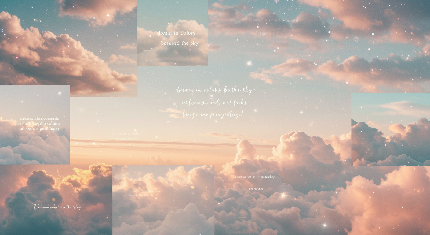 A serene collage of pastel-hued clouds and shimmering galaxies, intertwined with elegant, cursive aesthetic text quotes like "dream in colors borrowed from the sky," softly illuminated as if they were gently whispered by the stars, creating a harmonious and ethereal backdrop.