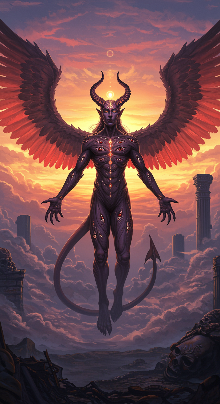 "Create an intricate digital artwork depicting a biblically accurate demon, captured in a moment of serene power amidst a landscape of ethereal clouds and ancient ruins. The creature, with detailed textures and vibrant, otherworldly colors, should exude a sense of awe and mystery, its numerous wings and eyes shimmering like gemstones under a twilight sky. This celestial being exists in a harmonious balance between fearsome majesty and mesmerizing beauty, providing a captivating yet enigmatic background suitable for an immersive wallpaper experience."