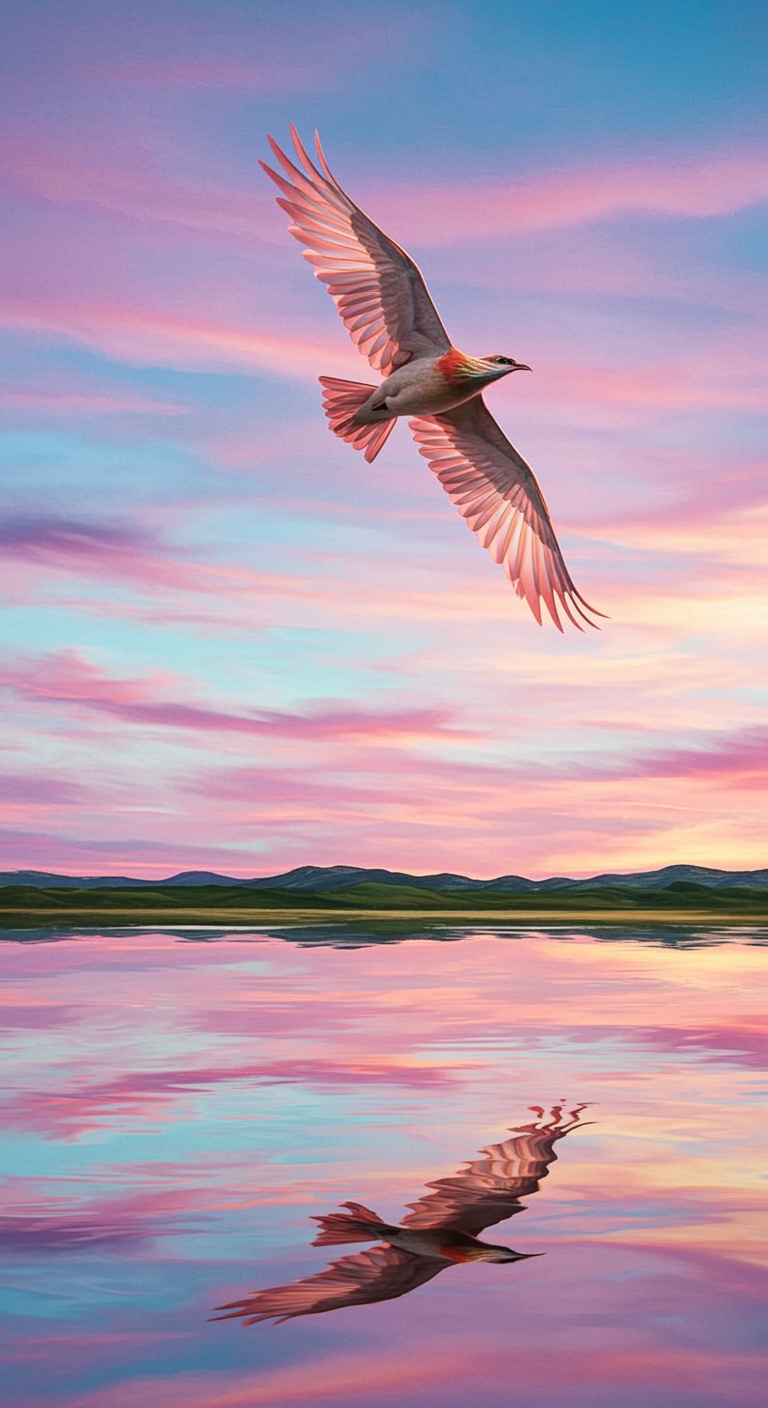 A symphony of colors unfolds as a majestic bird with iridescent feathers gracefully soars through a dreamy, pastel-hued sky; below, an abstract landscape of gentle rolling hills and shimmering lakes mirrors the vivid hues above, creating an enchanting harmony that captivates the viewer, inviting them to imagine soaring through this serene, otherworldly realm with the bird.