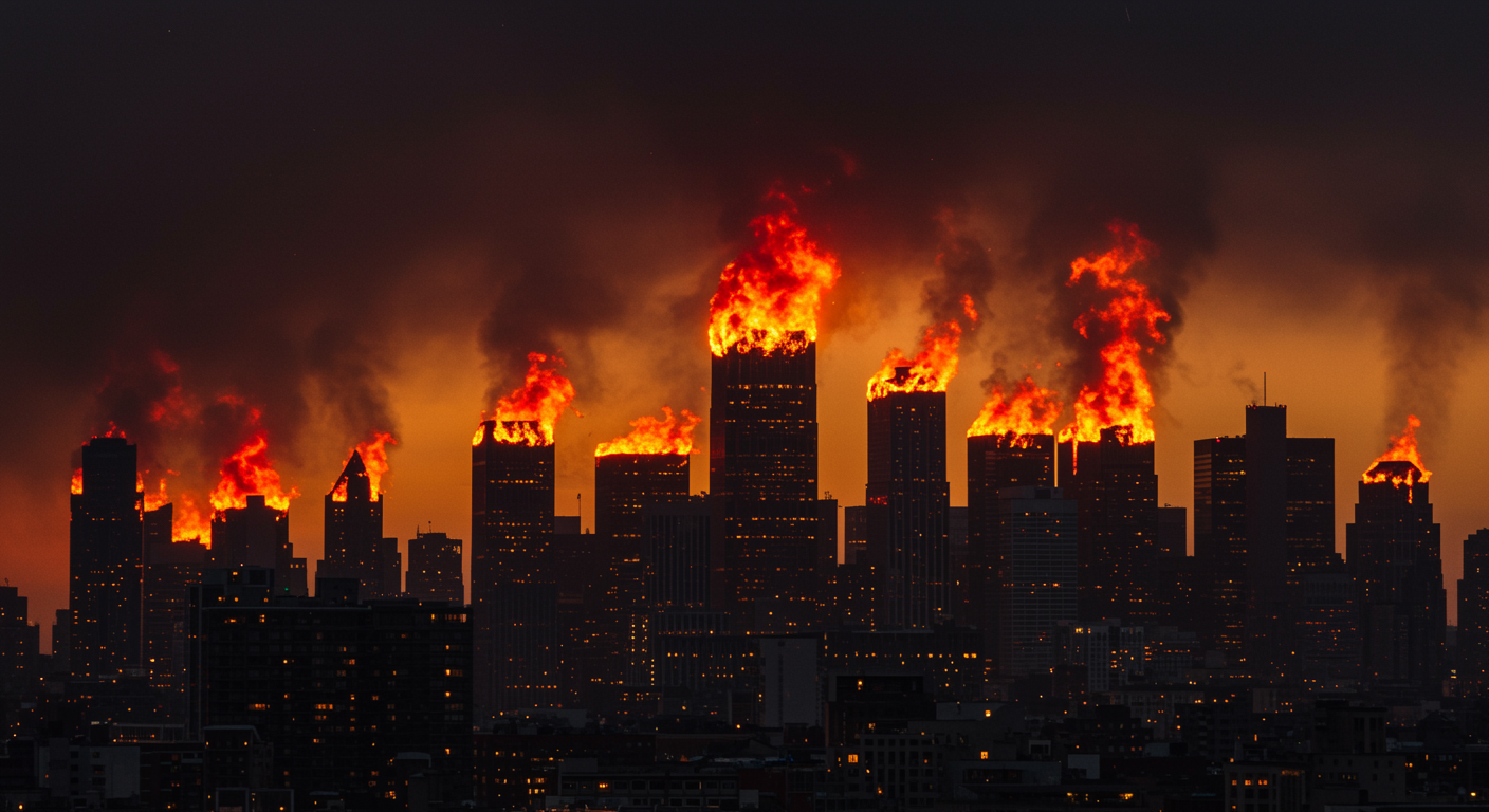 A surreal cityscape at twilight, where towering skyscrapers are engulfed in vibrant, ethereal flames that dance with shades of orange, red, and gold; the skyline alive with hues of burning embers that contrast against a dark, smoky sky, while reflective glass facades of the buildings cast haunting shadows, creating an intense yet mesmerizing backdrop filled with atmospheric drama and a touch of fantasy.