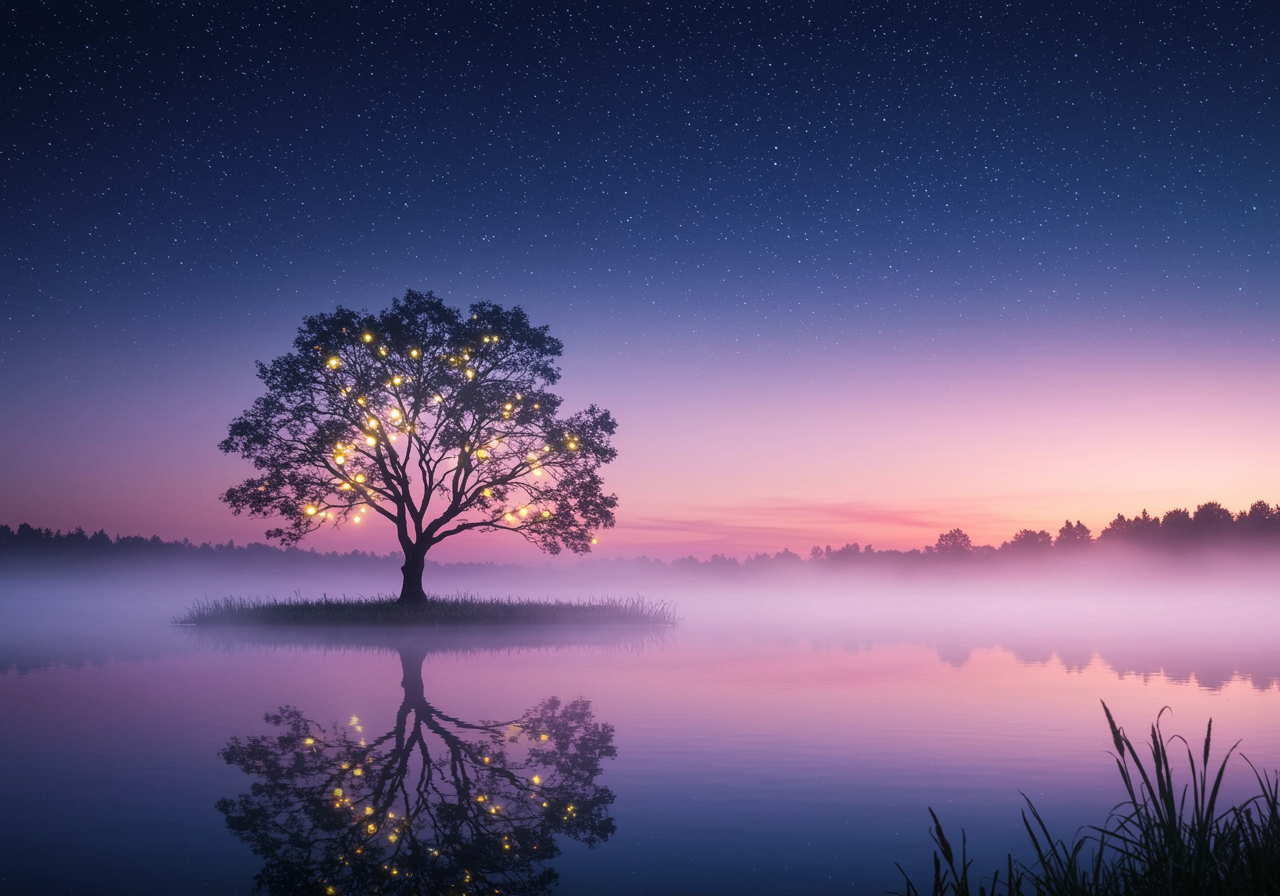 Create a soothing digital wallpaper featuring a dreamlike landscape at twilight, where pastel hues of pink and lavender blend seamlessly into a deep indigo sky speckled with soft, luminous stars, with a solitary tree whose delicate branches are adorned with twinkling fairy lights, casting gentle reflections on a misty lake, evoking a tranquil and ethereal aesthetic that invites serenity and imagination.