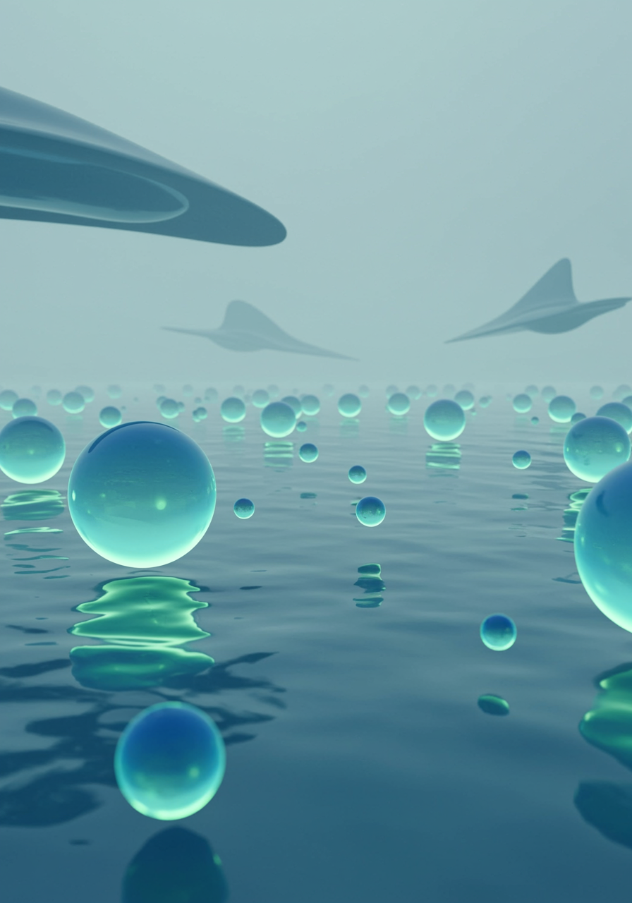 Imagine a serene digital landscape where smooth, bubble-like forms in soft gradients of blue and green gently float among a field of glowing, translucent spheres. These spheres emanate a delicate, ambient light that casts subtle reflections on a glossy, liquid-like surface, reminiscent of a pristine pond at dawn. The atmosphere is imbued with an ethereal fog, giving the scene an otherworldly yet calming quality, capturing the hallmarks of the Frutiger Aero aesthetic. In the distance, abstract, aerodynamic shapes with futuristic contours suggest movement and direction, evoking a sense of endless possibilities and tranquil exploration.