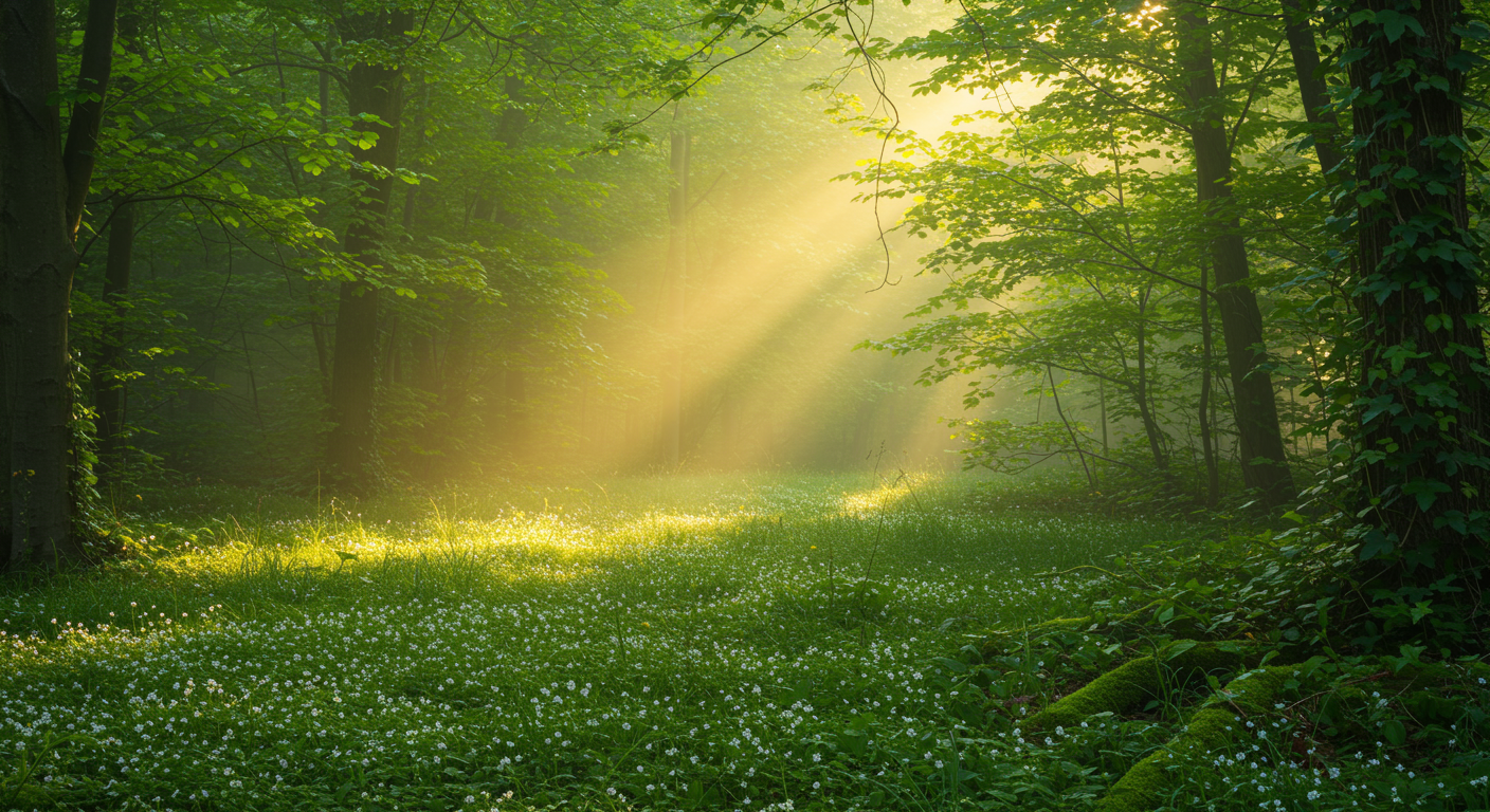 Imagine a serene forest at dawn, where rays of soft golden light pierce through a canopy of lush, emerald leaves, casting intricate patterns on a tranquil forest floor covered in moss and tiny white flowers. In the background, a gentle mist lingers, creating an ethereal glow that bathes the scene in hues of jade and lime, while delicate vines twist around ancient trees, adding texture and depth to the landscape. This enchanting green aesthetic captures a moment of natural tranquility, inviting viewers to immerse themselves in its soothing beauty.