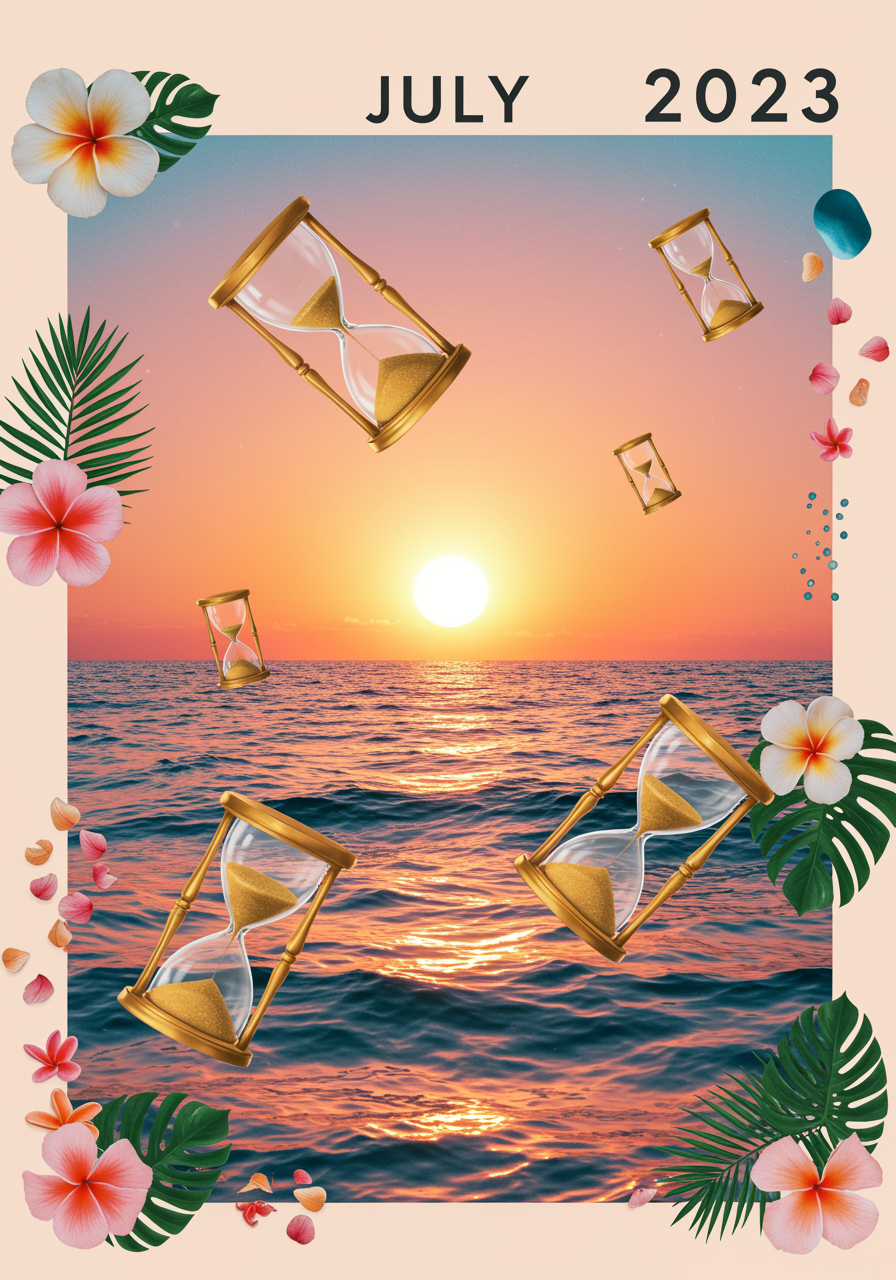 A vibrant collage of surreal summer elements forming the shape of a calendar page for July 2023, featuring a brilliant sun setting over an abstract ocean of swirling blues and pinks, interspersed with floating golden hourglasses symbolizing time, all adorned with tropical flowers and leaves subtly incorporating date numbers, perfect for a lively and imaginative digital wallpaper.