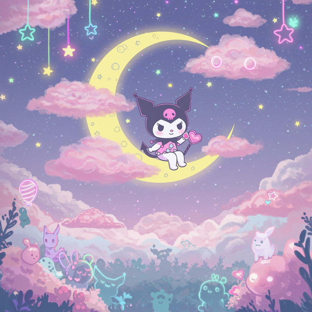 A dreamy, pastel-hued digital landscape featuring the mischievously cute character Kuromi. She's perched on a crescent moon, surrounded by twinkling stars and wispy clouds that resemble candy floss. Neon accents and soft shadows create a playful yet edgy atmosphere, blending kawaii charm with a touch of punk flair. Below, hints of an enchanted forest can be seen, with whimsical creatures peeking through the foliage, adding layers of mystery and magic. The overall composition is a harmonious blend of light and dark, capturing the essence of Kuromi's enigmatic aesthetic.