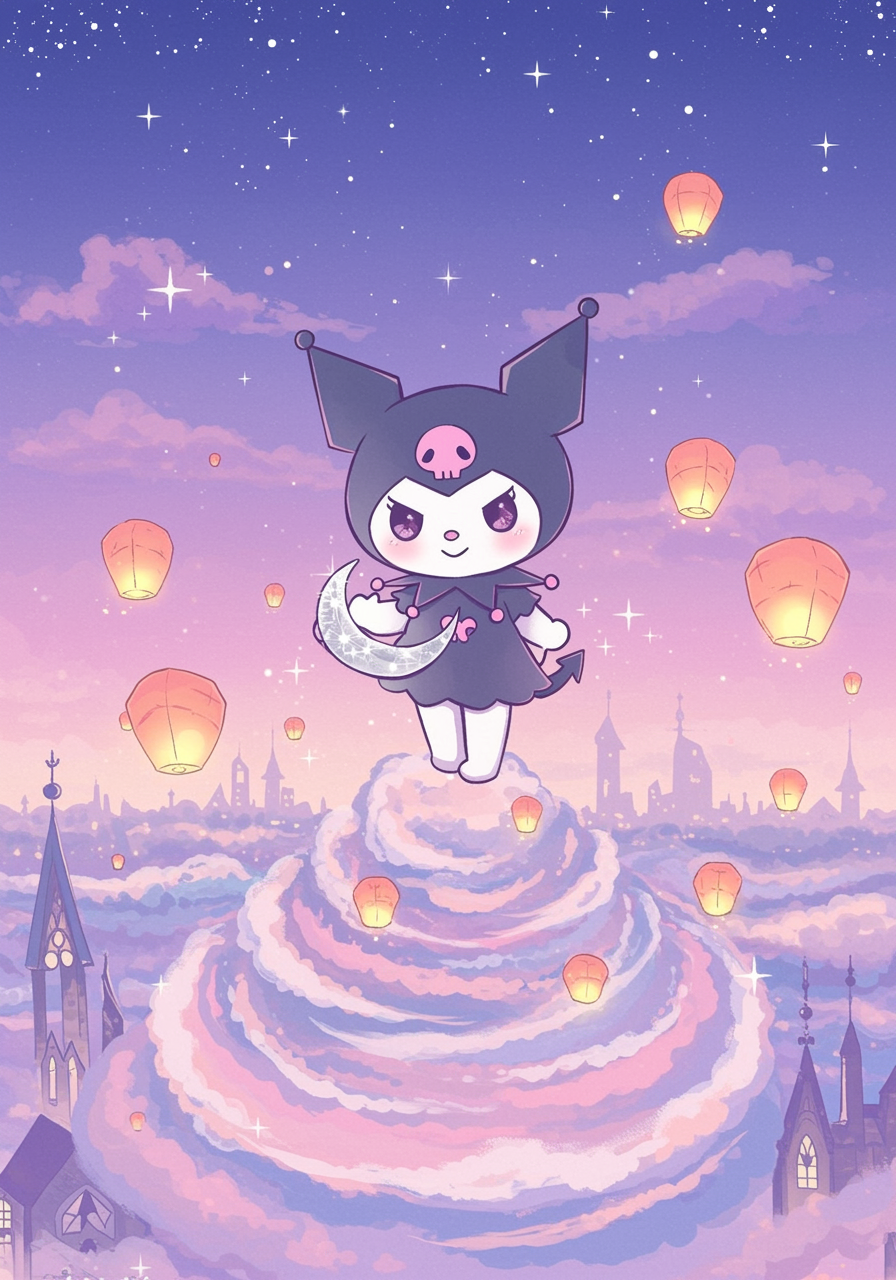"Imagine a dreamy, pastel-hued world where Kuromi, the mischievous yet charming character, stands confidently atop a swirl of clouds infused with shimmering stars. This celestial landscape, bathed in soft gradients of lavender, pink, and midnight blue, features Kuromi sporting her signature jester hat and skull emblem, playfully clutching a silver crescent moon. Around her, tiny floating lanterns emit a gentle glow, casting whimsical shadows against an ethereal cityscape with delicate Gothic-inspired architecture in the background. This image is a perfect blend of edgy and adorable, capturing the unique aesthetic of a Kuromi-themed dreamscape wallpaper."