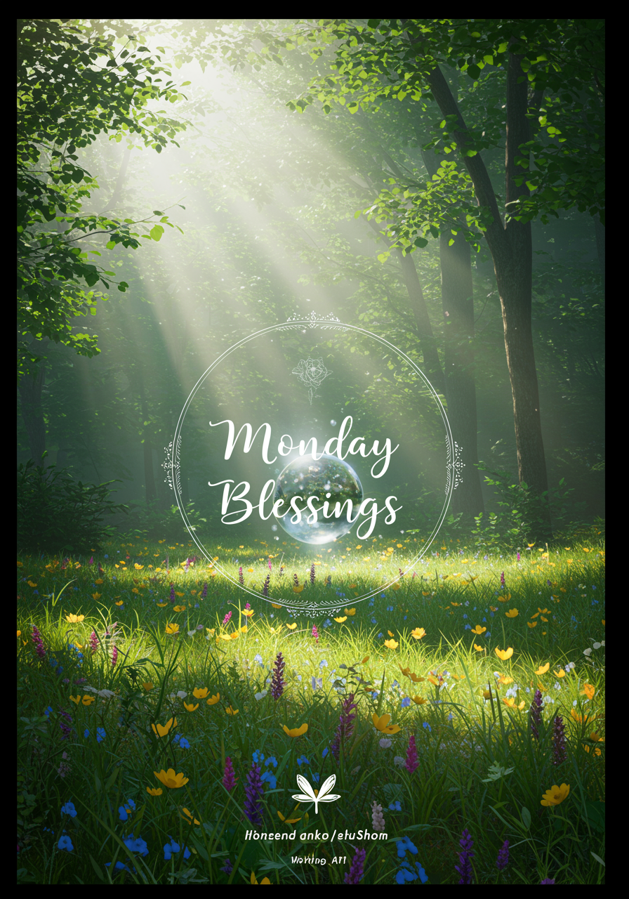 A serene digital painting of a sunlit forest glade where soft beams of morning light filter through lush green canopy, casting gentle patterns on a carpet of vibrant wildflowers; in the center, a delicate crystal orb floats, refracting light into a spectrum of colors, and inscribed within, subtle calligraphy spells out "Monday Blessings," evoking a sense of calm and renewal with nature's embrace as your weekly inspiration.