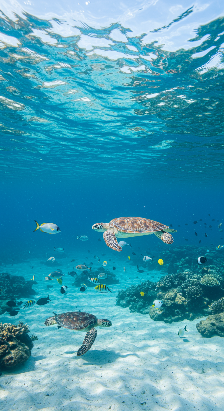 A serene underwater scene where vibrant schools of fish swim gracefully through a kaleidoscope of ocean blue hues, sunlight streams through the waves above creating intricate patterns on the sandy seabed, while majestic sea turtles glide effortlessly, their shells reflecting the shimmering blue tones, encapsulating the tranquil beauty of the ocean in a mesmerizing visual symphony.
