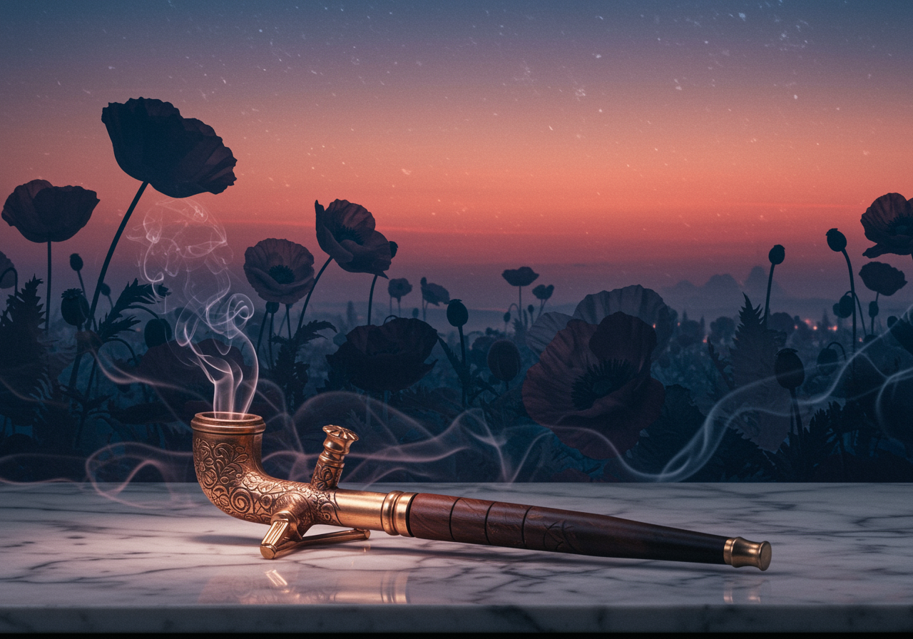 A mesmerizing wallpaper capturing an opium aesthetic: envision a dreamlike scene where a serene twilight sky meets the horizon, painted in hues of deep indigo and warm rose. Ethereal, smoke-like tendrils weave through a landscape of lush, oversized poppies in bloom, their petals shimmering like satin under a gentle moonlight. In the foreground, an ornate, vintage opium pipe rests on a marble surface, its intricate carvings illuminated by the ambient glow. The atmosphere is tranquil yet intoxicating, inviting the viewer into a world of surreal beauty and contemplation.
