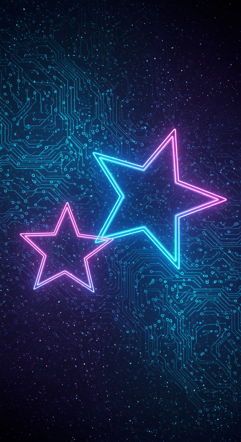 "Immerse yourself in a futuristic dreamscape where glowing neon stars hover against a backdrop of iridescent circuitry patterns, blending Y2K nostalgia with cybernetic elements. Metallic chrome hues intertwine with vibrant blues and purples, creating a mesmerizing tapestry of intertwining fractals and digital constellations, designed to evoke both awe and serenity. This wallpaper encapsulates a world where digital dreams meet celestial wonder, merging the allure of early 2000s cyber aesthetics with the infinite possibilities of the cosmos."