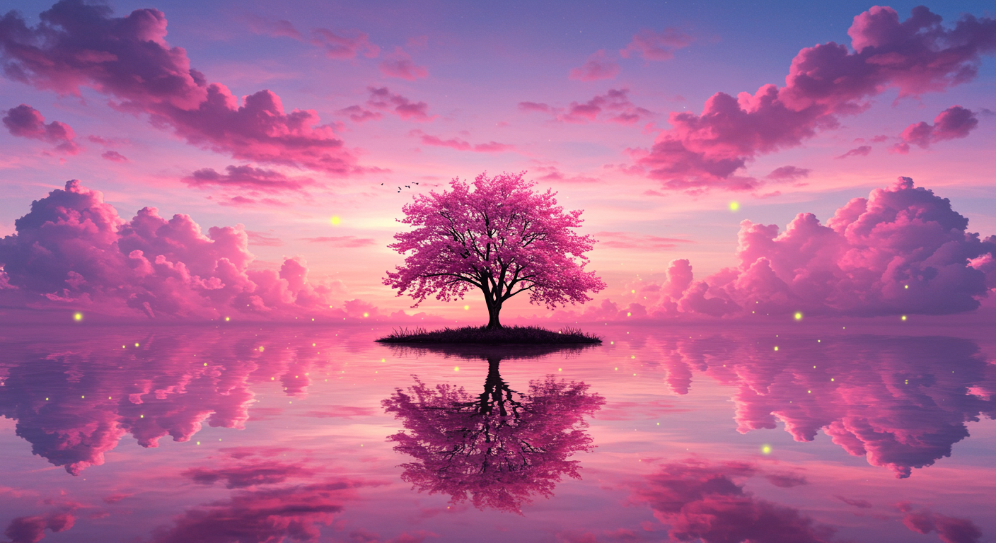 Imagine a serene landscape at twilight where the sky is awash with shades of pink, ranging from soft pastel blush to deep magenta. Wispy clouds lazily drift across the horizon, their delicate forms reflecting the pink hues as if dipped in cotton candy. Below, a tranquil lake mirrors the vivid colors of the sky, with gentle ripples distorting the reflection into an abstract masterpiece. Silhouetted against this vibrant backdrop, a lone cherry blossom tree stands on a small island, its branches adorned with blossoms that mimic the colors above. Tiny fireflies begin to dance around the scene, their soft luminescence adding a sprinkle of magic to this enchanting vista. This image encapsulates a dreamlike fusion of nature and fantasy, providing a captivating and soothing wallpaper for any device.