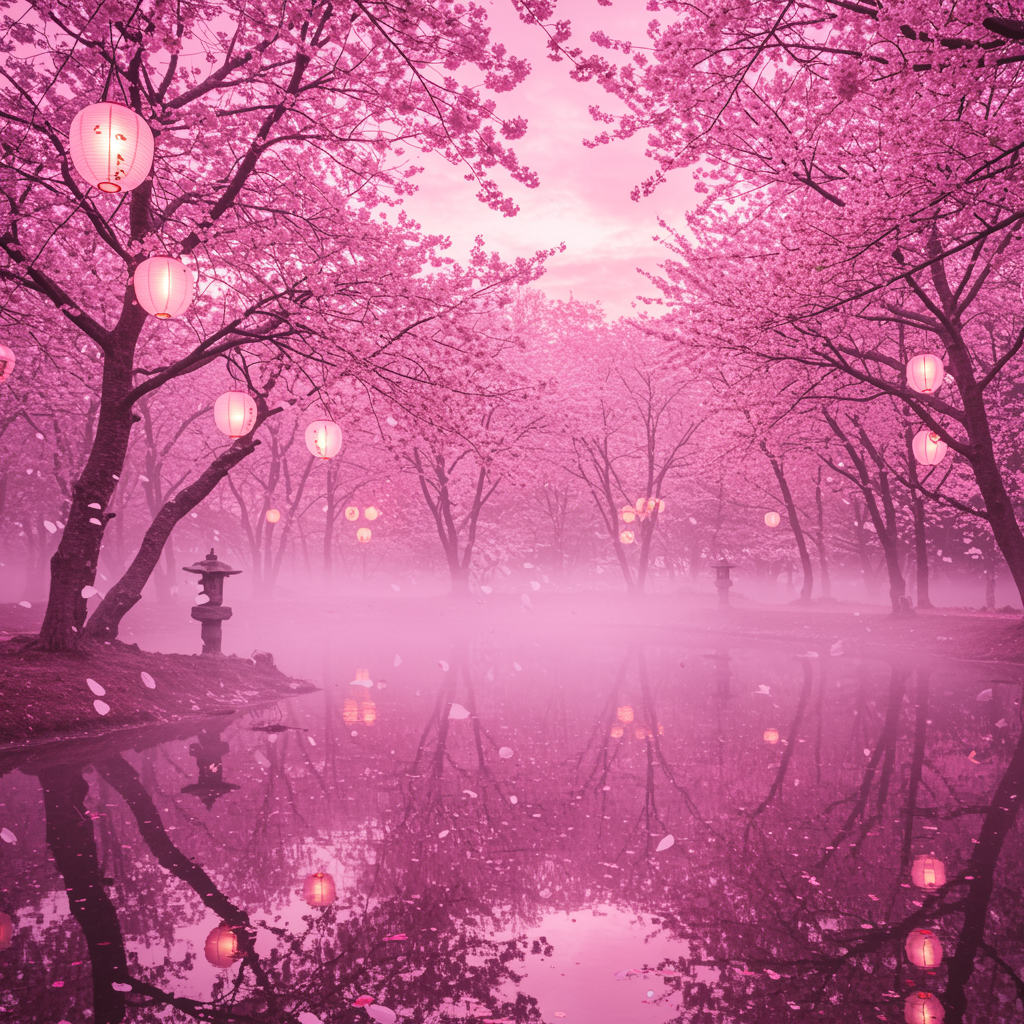 Imagine a serene twilight garden bathed in a mystical pink hue, where delicate cherry blossoms float gently in the air, mingling with soft wisps of mist; the scene is illuminated by ethereal lanterns hanging from ancient branches, casting a dreamy glow on a tranquil pond that mirrors the cotton candy skies above, creating a harmonious blend of nature and fantasy, perfect for a pink wallpaper aesthetic.