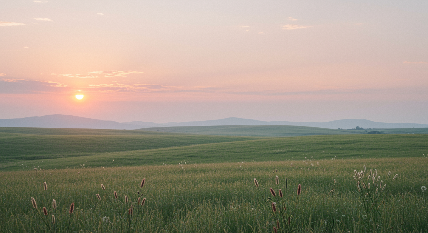 A tranquil landscape of rolling hills bathed in the soft glow of a setting sun, with sage green fields stretching endlessly, dotted with whimsical wildflowers swaying gently in a warm breeze; the sky above a dreamy watercolor canvas of muted pinks and oranges, casting a serene and ethereal light over the scene, embodying a minimalist harmony perfect for a calming and aesthetically pleasing wallpaper.