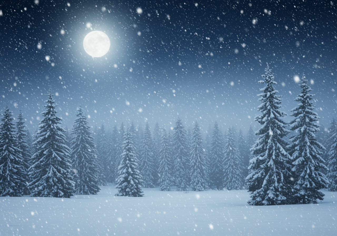 A serene winter landscape bathed in the soft glow of a full moon, where delicate snowflakes dance through the crisp night air, gently blanketing the evergreens and whispering secrets to the silent forest. The sky is a swirl of deep indigo and shimmering silver, dotted with twinkling stars, while an ethereal, gentle mist weaves between the trees, adding a dreamlike quality to the scene, capturing the essence of a tranquil snowfall as it transforms the world into a magical snow aesthetic.