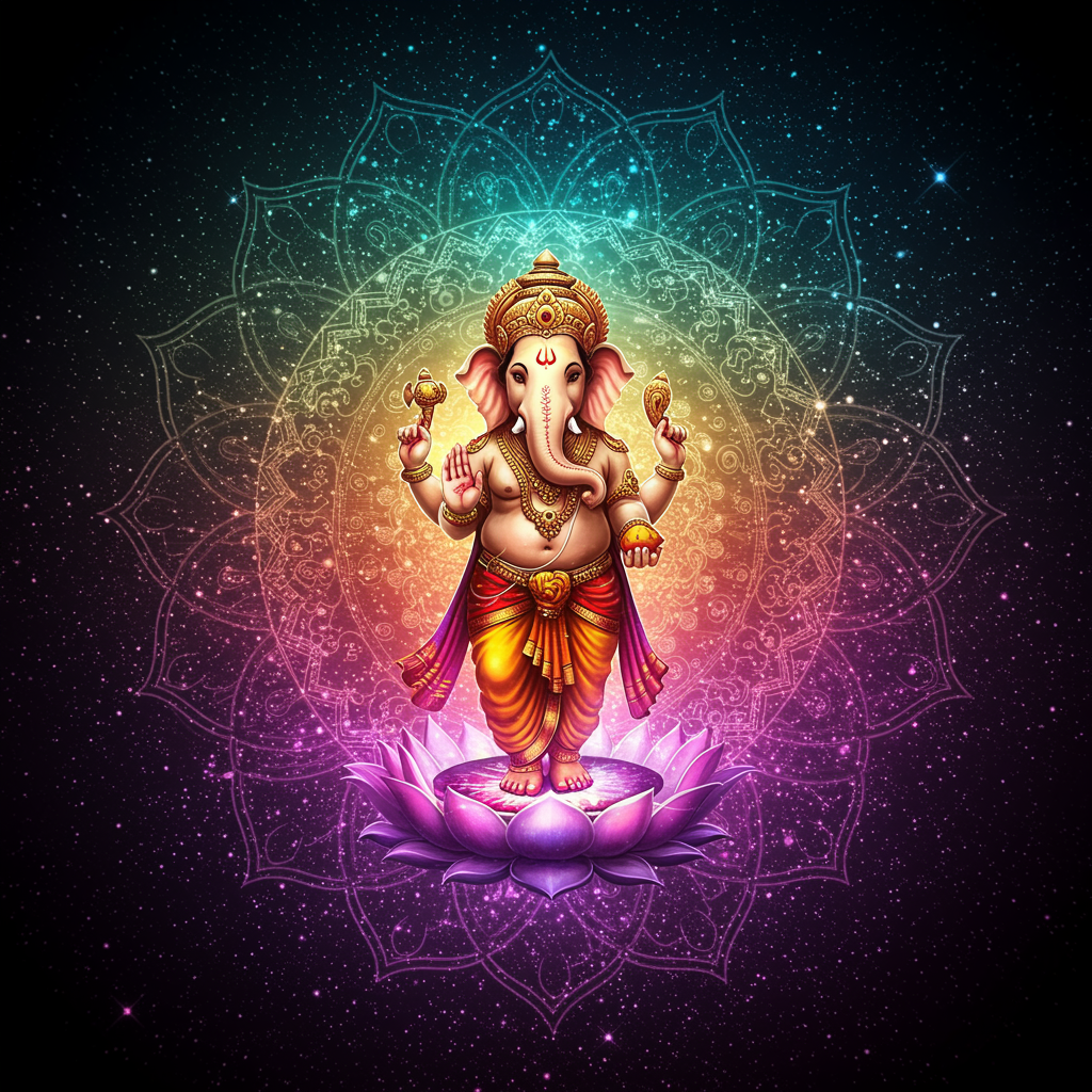 In a mystical realm where tradition and innovation merge, imagine a wallpaper featuring an ethereal depiction of Lord Vinayagar, the beloved elephant-headed deity. Surrounded by a celestial dance of swirling, luminescent mandalas that shimmer with every hue of the spectrum, Vinayagar stands atop a cosmic lotus pedestal floating amidst a starry expanse. His aura radiates warmth and wisdom, while digital circuits and vibrant particles orbit around, symbolizing the fusion of ancient divinity with modern technology. This captivating composition conjures a serene yet dynamic atmosphere, inviting contemplation and digital harmony.