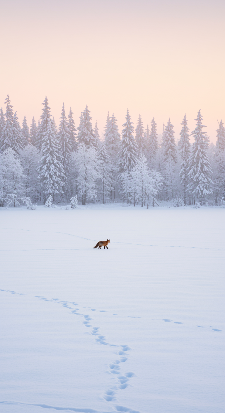 A serene winter wonderland unfolds as gentle snowfall kisses a vast expanse of untouched snow, where tall, ethereal pine trees are dusted with pure white and the horizon shimmers with the soft pastel hues of an early morning sunrise, while a solitary red fox quietly weaves its way through the tranquil scene, leaving a delicate trail of paw prints that tell a story of resilience and quiet beauty.