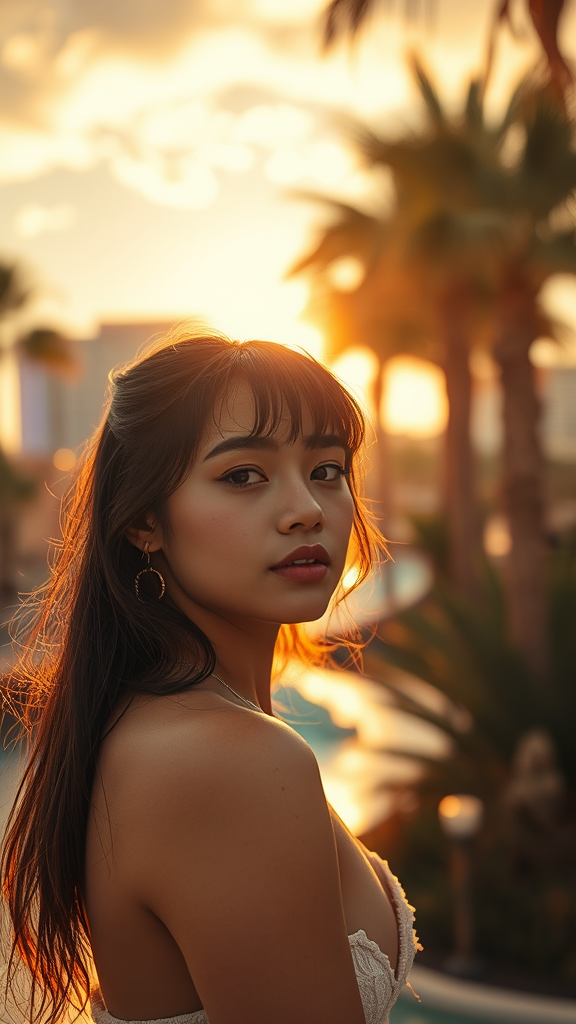 1 girl, 21 years old, intricately detailed, high quality, dramatic, ray tracing, photograph, luxurious tropical Las Vegas setting during Golden hour, hyper-realistic, Queercore Art style, encompassing broad lighting, film grain effect, captured with a film camera, enhanced by a circular polarizer, subtle sepia tone, reminiscent of an Instagram aesthetic, UHD resolution, dslr-inspired 3D visuals, integrating elements of drawings, abstract art, surrealist painting, and conceptual graphics, all woven into a sophisticated collage, with an artistic touch of intimacy, letter, artistic nude.