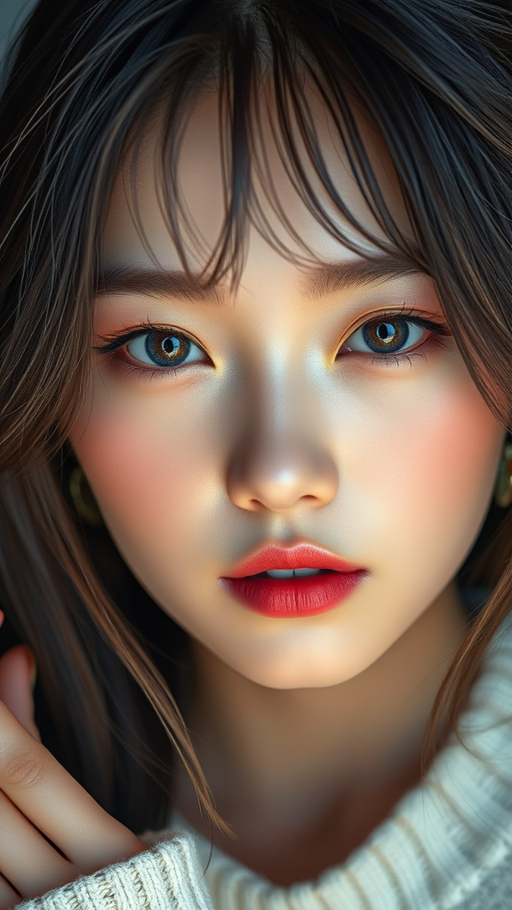 1 girl, a stunning Korean woman, kpop star, symmetrical features, ultra high-resolution, photorealistic, 8k imagery, hyperrealistic with dramatic lighting, photographic aesthetics, utilizing advanced rendering techniques, exceptional quality, high detail RAW color professional close-up capture, beautifully detailed eyes, ulzzang-6500-v1, avoiding negative elements such as CGI, 3D look, doll-like features, cartoonish effects, anime style, illustrations or sketches, low resolution, text overlays, cropped images, jpeg distortions, unattractive duplicates, imprecise facial features, deformation, blurriness, logos, oversized hands, unattractive mouth, or unsightly eyes.