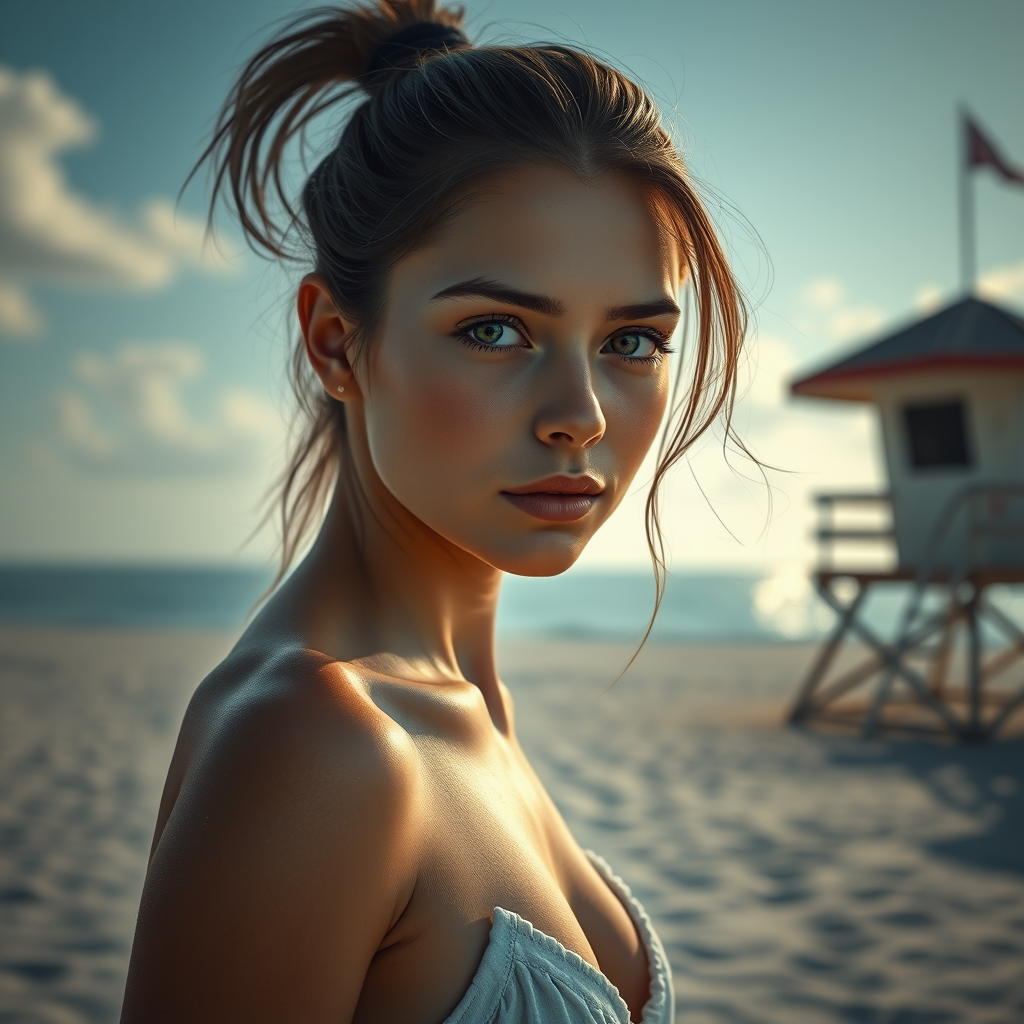 1 girl at the beach near a lifeguard tower with a toned physique and symmetrical eyes, dramatic realistic lighting creating a high-definition sharp focus. The scene captures hyperrealism with intricate detail and a photography style that uses raytracing and physics-based rendering. The high-detail image, like a RAW color photo, is captured in ultra-high resolution, serving as a highly detailed CG unified 8K wallpaper. The composition includes rim lighting with vivid colors, showcasing vibrant post-processing and expert color grading.