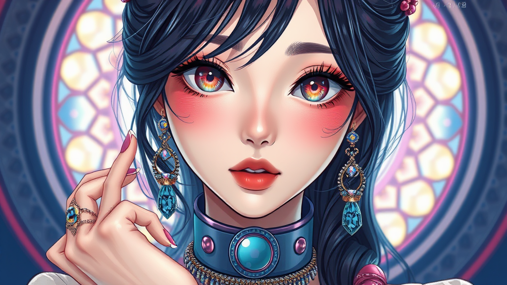 1 girl, stunning Korean woman, K-pop idol, intricate symmetrical eyes, ultra-realistic jewelry, vivid buttons, CGI detail, 3D doll-like features, rendered in octane, blend of cartoon and anime aesthetics, creative illustration, dynamic digital art, vivid digital painting, subtle text elements, tightly cropped composition, characterized with slight jpeg artifacts.
