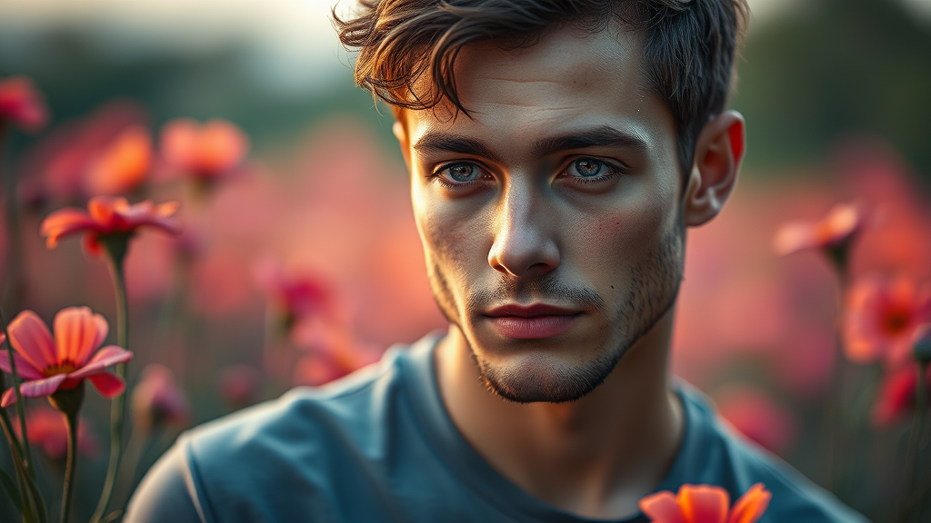 1 man solo piercing purple eyes finely detailed breathtaking cinematic lighting daytime dynamic lighting simple background depth of field CG casual clothes vibrant flowers crisp clear normal quality side view artistically rendered bold youthful expression minimalistic setting