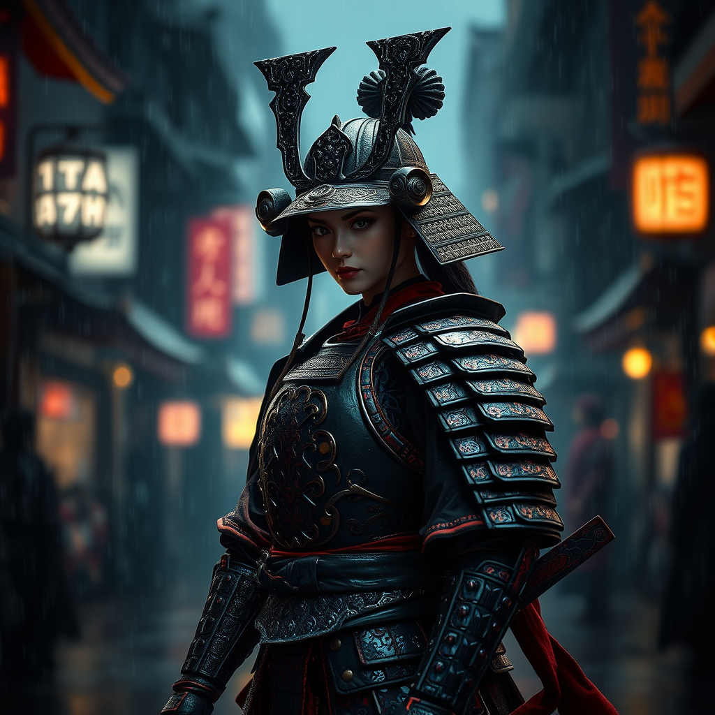 12th century female samurai in intricate black and red armor, reminiscent of styles by Greg Rutkowski, Guweiz, and Yoji Shinkawa, standing poised in a dark, rain-soaked city. Cinematic lighting accentuates the hyperrealistic details of her armor, while raindrops create mesmerizing lumen reflections. The background blurs with a subtle depth of field, creating a stark contrast between the stunningly detailed samurai figure and the moody urban environment, capturing a sense of fierce elegance amidst the dramatic atmosphere.