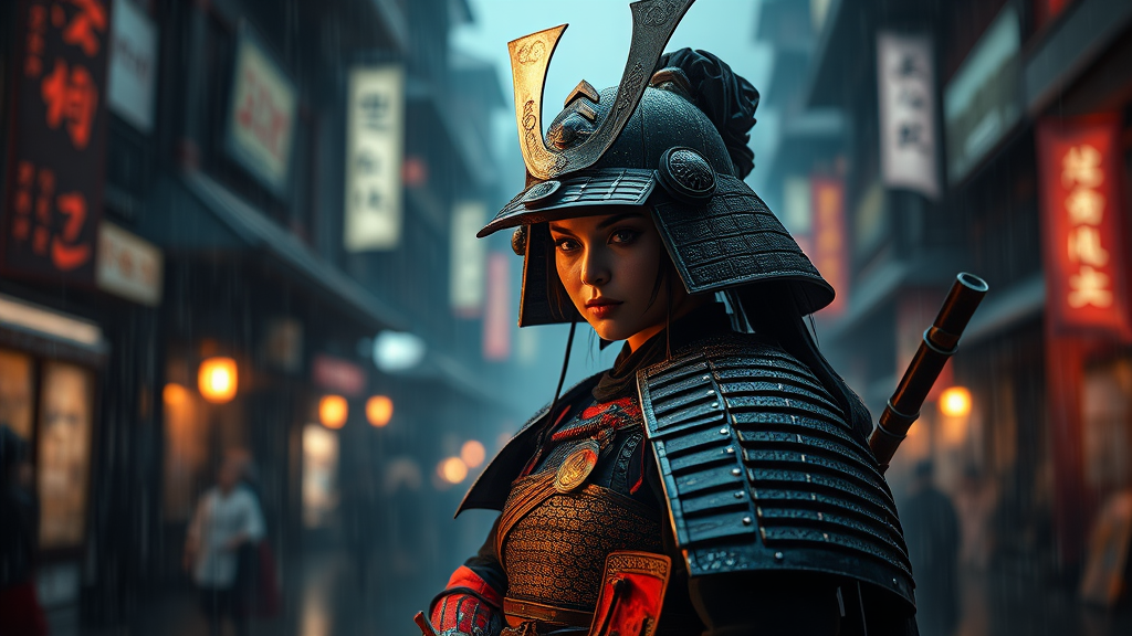 12th century female samurai inspired by Greg Rutkowski, Guweiz, and Yoji Shinkawa, wearing intricately detailed black and red armor, set in a cinematic dark rainy cityscape, featuring dramatic lighting, depth of field elements, and luminous reflections; the environment is stunning and hyper-realistic, with an atmosphere that captures both the intensity and elegance of the era, amidst the shadows and glistening surfaces that highlight the samurai's presence.