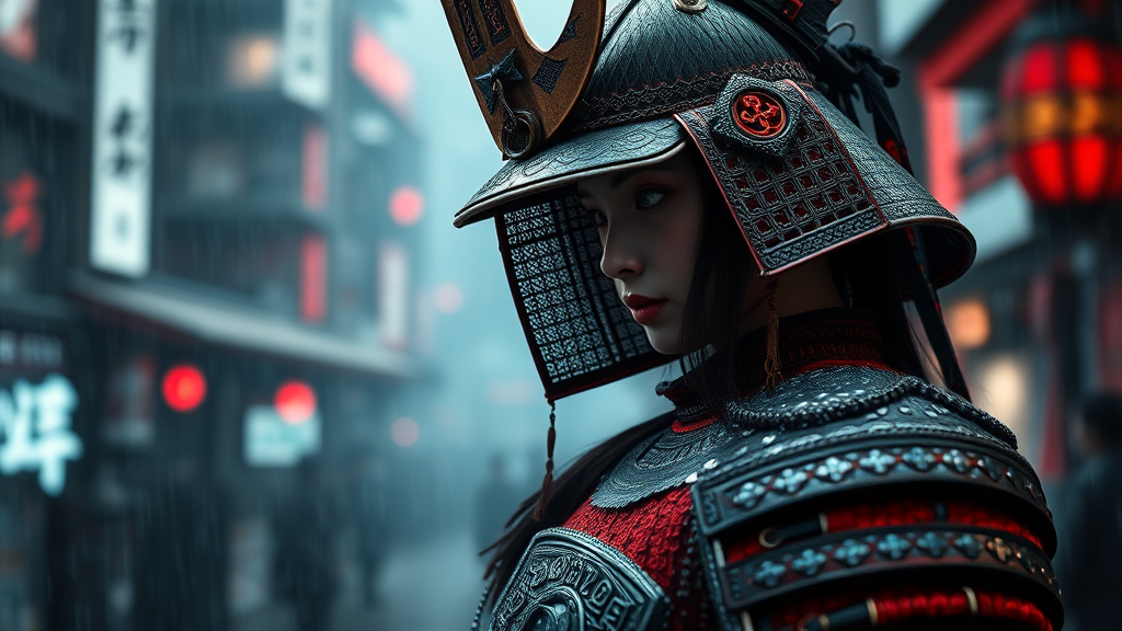 12th century female samurai warrior, intricate black and crimson red samurai armor, inspired by the styles of Greg Rutkowski, Guweiz, and Yoji Shinkawa, set in a cinematic dark and rainy cityscape, depth of field, vivid lumen reflections, photographic realism, breathtaking ambiance, strikingly beautiful, ultra detailed, 8k resolution, hyperrealism, astonishingly detailed elements, blending tradition with artistic flair and modernity, creating an enigmatic and powerful presence.
