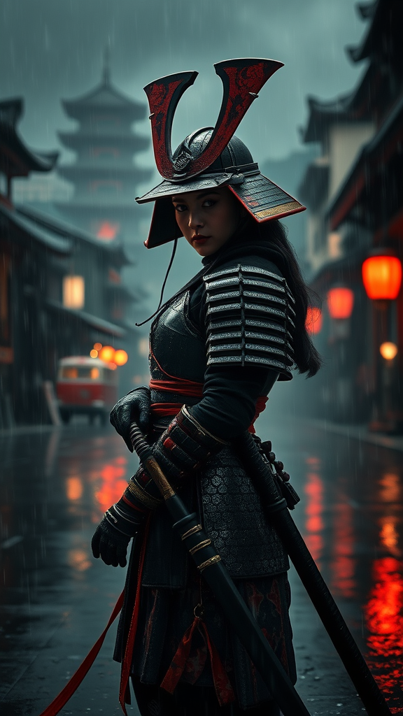 12th century female samurai with intricate black and red armor, inspired by the styles of Greg Rutkowski, Guweiz, and Yoji Shinkawa, standing in a dark, rain-soaked city. The scene is illuminated by cinematic lighting with deep shadows and vibrant highlights. The background features blurred silhouettes of ancient architecture, enhancing the depth of field. Lumen reflections dance on the wet surfaces, creating a stunning environment with a moody atmosphere. The overall composition is hyper-realistic and ultra-detailed, capturing the intensity and grace of the warrior amidst the stormy backdrop in 8k resolution.